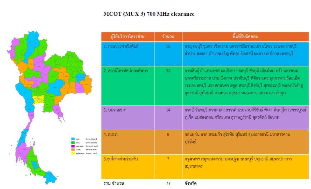 นายเขมทัตต์ พลเดช กรรมการผู้อำนวยการใหญ่ บริษัท อสมท จำกัด (มหาชน) ในฐานะประธานชมรมผู้ให้บริการโครงข่ายโทรทัศน์ระบบดิจิทัล (MUX) หรือ Digital Television Network Provider Society (DNPS) กล่าวว่า ผู้ให้บริการโครงข่ายโทรทัศน์ระบบดิจิทัล (MUX) เดินหน้าปรับปรุงโครงข่ายโทรทัศน์ภาคพื้นดินในระบบดิจิทัลเพื่อรองรับการเรียกคืนคลื่นความถี่ย่าน 700 เมกะเฮิรตซ์ ของ กสทช. เริ่ม ก.ย.นี้ พร้อมเปิดคู่สายผู้ให้บริการโครงข่ายฯ เพื่อให้ประชาชนในพื้นที่สอบถาม หากพบปัญหาในการรับชม ทั้งนี้ตามที่ กสทช.ได้จัดการประมูลคลื่นความถี่ในย่านต่างๆ รวมถึงคลื่นความถี่ในย่าน 700 เมกะเฮิรตซ์ ที่ใช้ในกิจการกระจายเสียง เพื่อนำมาใช้ในกิจการโทรคมนาคมในการรองรับเทคโนโลยี 5G เมื่อวันที่ 16 กุมภาพันธ์ 2563 ที่ผ่านมานั้น ส่งผลให้ผู้ให้บริการโครงข่ายฯ ต้องดำเนินการปรับปรุงอุปกรณ์เครื่องส่งออกอากาศ โครงข่ายโทรทัศน์ภาคพื้นดินในระบบดิจิทัล เนื่องจากสัญญาณอาจประสบปัญหาโดยจะเริ่มดำเนินการปรับปรุงโครงข่ายฯ ในพื้นที่ความรับผิดชอบของแต่ละโครงข่ายฯ ระหว่างเดือนกันยายน 2563 – กุมภาพันธ์ 2564 เริ่มพื้นที่ภาคใต้เป็นพื้นที่แรกซึ่งจะเริ่มดำเนินการในช่วงเดือนกันยายน 2563 จากนั้นจะเริ่มดำเนินการในพื้นที่กรุงเทพฯและปริมณฑล และบริเวณใกล้เคียงในวันที่ 5 ตุลาคม 2563 ต่อด้วยพื้นที่ภาคเหนือในเดือนตุลาคม 2563 พื้นที่ภาคตะวันออกเฉียงเหนือในเดือนพฤศจิกายน 2563 และพื้นที่ภาคกลาง ภาคตะวันตก และภาคตะวันออก คาดว่าจะเริ่มภายในเดือนมกราคม 2564 และสิ้นสุดในเดือนกุมภาพันธ์ 2564