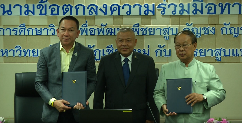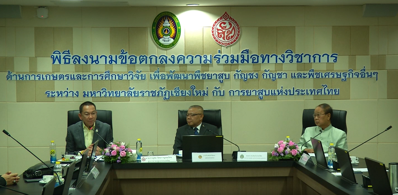 วันนี้ (2 ก.ย.) ที่มหาวิทยาลัยราชภัฏเชียงใหม่ นายภาณุพล รัตนกาญจนภัทร ผู้ว่าการการยาสูบแห่งประเทศไทย (ยสท.) และ รศ.ดร.ประพันธ์ ธรรมไชย รักษาราชการแทนอธิการบดีมหาวิทยาลัยราชภัฏเชียงใหม่ ร่วมลงนามบันทึกข้อตกลงความร่วมมือ ในการศึกษาวิจัยกัญชงและกัญชารวมถึงพืชเศรษฐกิจอื่น ๆ เพื่อนำงานวิจัยไปใช้ประโยชน์และบริการ รวมถึงสร้างโอกาสทางธุรกิจใหม่ ๆ