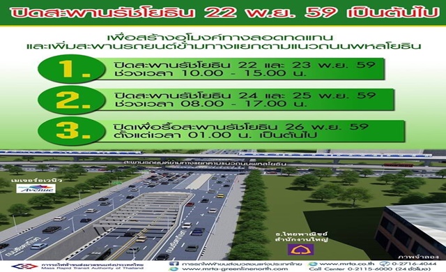 ผู้สื่อข่าวรายงานว่าภายหลังกองบัญชาการตำรวจนครบาลประกาศเลื่อนการปิดถาวรสะพานข้ามแยกรัชโยธิน เพื่อรื้อถอนสะพานรองรับการก่อสร้างรถไฟฟ้าสายสีเขียว ช่วงหมอชิต-สะพานใหม่-คูคต ซึ่งเดิมกำหนดปิดสะพานคืนนี้ เพื่อเก็บข้อมูลผลกระทบจากการรื้อถอนสะพานและเพื่อให้การจัดการจราจรเป็นไปอย่างรอบคอบ และตั้งแต่วันนี้จนถึงวันที่ 29 พฤศจิกายนยังทดลองปิดสะพานในช่วงเวลา 08.00-17.00 น. เพื่อเก็บข้อมูลการเคลื่อนตัวของรถและปริมาณสะสมของรถในถนนแต่ละด้าน โดยเฉพาะวันจันทร์ซึ่งมีรถคับคั่งกว่าปกติ จากนั้นจะนำข้อมูลเสนอที่ประชุมคณะอนุกรรมการบูรณาการขับเคลื่อนการแก้ไขปัญหาจราจรในเขตกรุงเทพฯ และปริมณฑล ในวันอังคารหน้าก่อนที่จะกำหนดแผนการรื้อสะพาน และแผนการจราจรอีกครั้ง