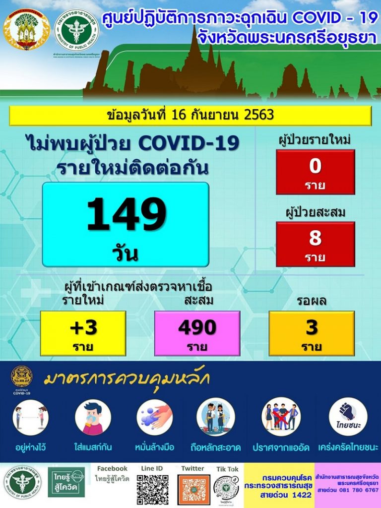 นายภานุ แย้มศรี ผู้ว่าราชการจังหวัดพระนครศรีอยุธยา เปิดเผยกรณีมีข่าวชาวเมียนมากลับประเทศและตรวจพบติดโควิด-19 จำนวน 2 ราย หลังกลับจากไทย โดยสงสัยจะเป็นพื้นที่พระนครศรีอยุธยาว่า ที่ผ่านมาจังหวัดพระนครศรีอยุธยามีมาตรการเฝ้าระวังโรคทั้ง 16 อำเภอ และไม่พบผู้ป่วยรายใหม่มาอย่างต่อเนื่องเป็นเวลา 149 วัน ซึ่งแสดงว่าไม่มีการแพร่ระบาดในพื้นที่อย่างแน่นอน อีกทั้งประชาชนทุกภาคส่วนให้ความร่วมมือดีในการปฏิบัติตามมาตรการสาธารณสุข เพื่อป้องกันโรค ไม่ว่าจะเป็นการสวมหน้ากากอนามัยทุกครั้งเมื่ออยู่ในชุมชนหรือที่สาธารณะ และการล้างมือ