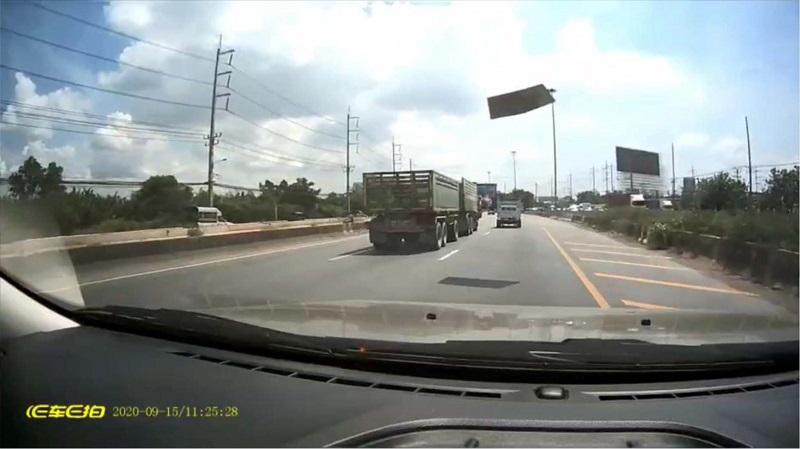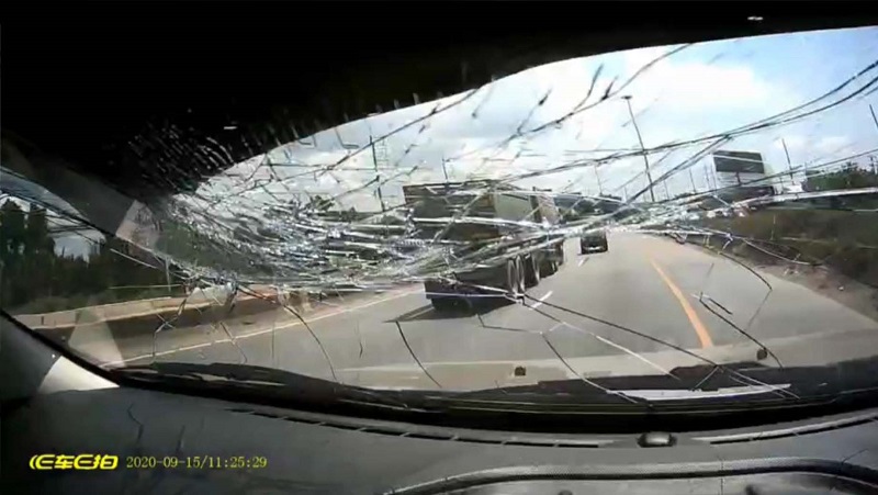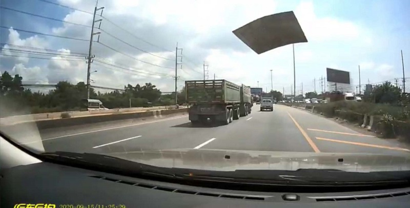นายสัมพัฒน์ ยงรู้รอบ อายุ 46 ปี เจ้าของรถกระบะ สีบรอนซ์ทอง ทะเบียน ตผ 3945 กรุงเทพมหานคร ที่ได้รับความเสียหาย นำคลิปจากกล้องหน้ารถ ซึ่งบันทึกเหตุการณ์ระทึกขณะขับรถข้ามสะพานแม่น้ำท่าจีน ถนนพระราม 2 สมุทรสาคร ฝั่งเข้า กทม. โดยแล่นตามรถบรรทุกเล็กส่งน้ำดื่ม ปรากฏว่าแผ่นเหล็กจากท้ายรถลอยละลิ่วปะทะใส่หน้ารถอย่างแรงจนกระจกแตก