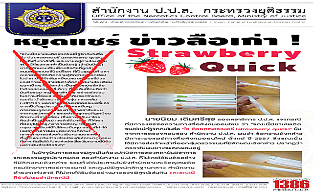 สำหรับข้อความที่นำมาแชร์ ซึ่ง ป.ป.ส.ตรวจสอบแล้ว ไม่เป็นความจริง คือ “ขณะนี้มียาเสพติดชนิดใหม่นี้รู้จักกันในชื่อ “ไว ด้วยสตอรเบอรี่ (strawberry quick)” เป็นสิ่งที่น่ากลัวที่แพร่หลายอยู่ตามโรงเรียนขณะนี้ ที่พวกเราจำเป็นต้องรู้ (ว่ามันมีอยู่) ยานี้มีลักษณะเป็นเม็ดคริสตัลที่ดูคล้ายขนมสตอรเบอรี่ป๊อปร็อค ที่เป็นลูกอมที่เวลาละลายจะทำให้เกิดความรู้สึกว่ามันแตกป๊อปในปาก ยานี้มีกลิ่นเหมือนสตอรเบอรรี่ด้วย และมีการแจกจ่ายมันให้เด็กตามสนามโรงเรียน พวกเด็กๆ จะเรียกว่า เม็ดสตอรเบอรี่หรือไวด้วยสตอรเบอรี่เด็กๆ ที่กินอันนี้โดยคิดว่ามันคือขนม จะถูกพาเข้า รพ อย่างเร่งด่วนในสภาพที่ร่อแร่ ยานี้มาได้กับชอคโกแลต เนยถั่ว น้ำอัดลม เชอรี่ องุ่น และรสส้ม (..เข้าใจว่า นอกจากจะเป็นรสสตอรเบอรี่แล้ว อาจเป็นในรูปขนมป๊อปร็อครสอื่นๆ) ควรสอนลูกหลานของท่านว่าอย่ารับขนมจากคนแปลกหน้า และอย่ารับลูกอมที่ดูเหมือนลักษณะนี้จากเพื่อน (ซึ่งอาจได้รับมาโดยคิดว่าเป็นลูกอม) และถ้าได้มาแล้ว ก็ให้เอาที่มีอยู่ไปให้ครู/อาจารย์ใหญ่ โดยทันที กรุณาส่งอีเมล์นี้ไปให้คนอื่นๆมากเท่าที่ทำได้ (แม้ว่าเขาอาจไม่มีบุตรหลานก็ตาม)เราจะสามารถช่วยกันเพิ่มความตระหนักตื่นตัวและหวังว่าจะช่วยป้องกันโศกนาฏกรรมที่อาจเกิดขึ้นได้ โปรดส่งต่อเพื่อเพิ่มความตื่นตัว เพราะมันช่วยได้จริงๆ”