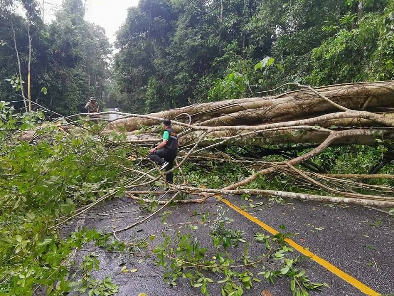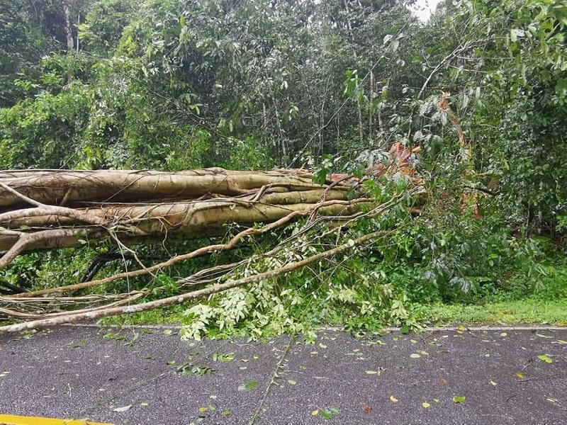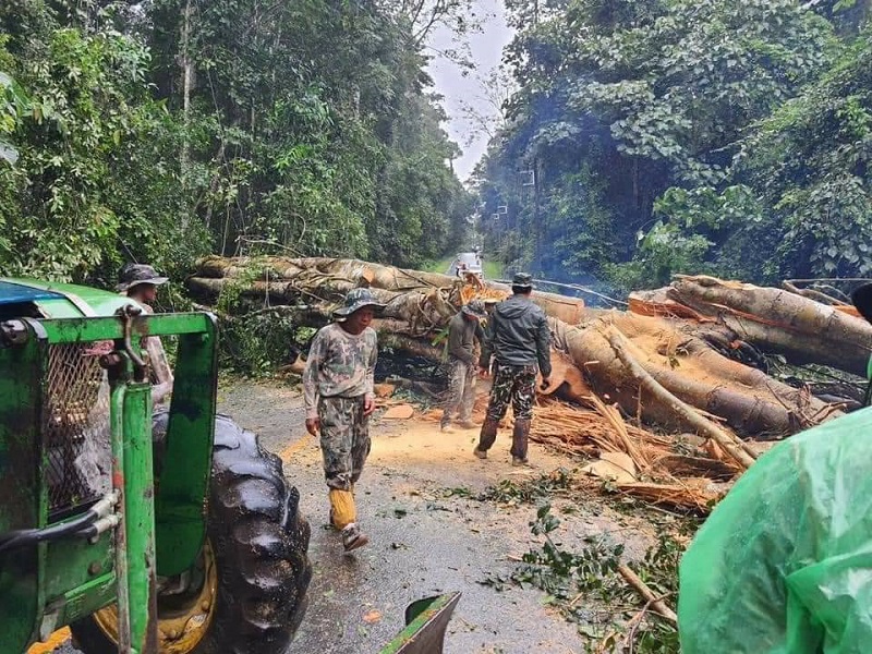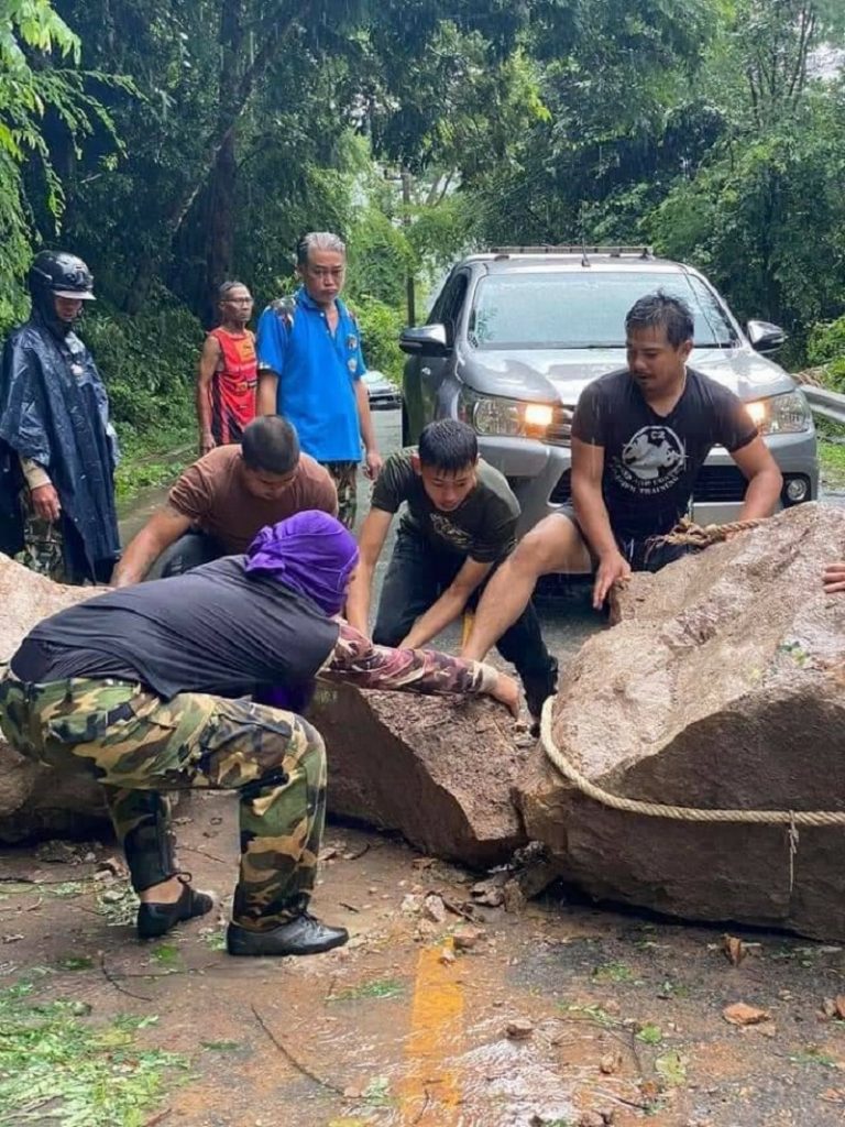 ว่าที่ พ.ต.นรินทร์ ปิ่นสกุล หัวหน้าอุทยานแห่งชาติเขาใหญ่ นำเจ้าหน้าที่ออกตรวจสอบเส้นทางขึ้นอุทยานฯ มีก้อนหินขนาดใหญ่ร่วงปิดถนนช่วง กม.28 และต้นไม้ล้มขวางช่วง กม.33 ฝั่งขึ้น-ลง ต.หมูสี อ.ปากช่อง จ.นครราชสีมา หลังเกิดฝนตกหนักตลอดคืนจากอิทธิพลของพายุโนอึล ทำให้ดินชุ่มน้ำมาก เจ้าหน้าที่ได้ช่วยกันใช้เลื่อยยนต์ตัดต้นไม้นำออกจากถนน และต้องใช้รถแทรกเตอร์ดันก้อนหินให้พ้นเส้นทาง