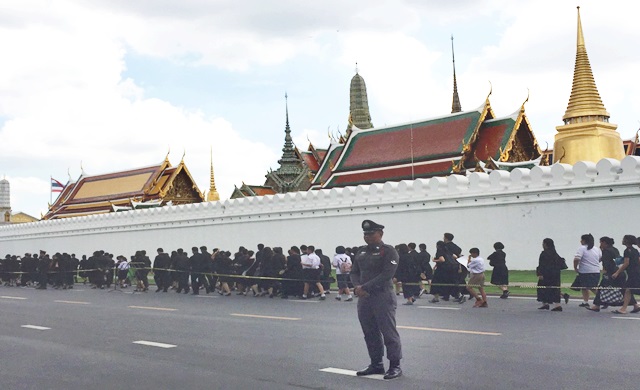 ในช่วงบ่ายแม้ว่าจะมีสภาพอากาศร้อนจัด แต่ยังมีประชาชนจำนวนมากจากทั่วสารทิศเดินทางมาเพื่อเข้าคิวเข้ากราบถวายบังคมพระบรมศพพระบาทสมเด็จพระปรมินทรมหาภูมิพลอดุลยเดช เช่น นายชิติ เจริญรัตนประภา หรือลุงชง อายุ 60 ปีซึ่งป่วยเป็นโรคเท้าแสนปม ซึ่งได้เดินทางมาจาก อ.เบตง จ.ยะลา มาถึงสนามหลวง เพื่อเข้าถวายบังคมพระบรมศพ