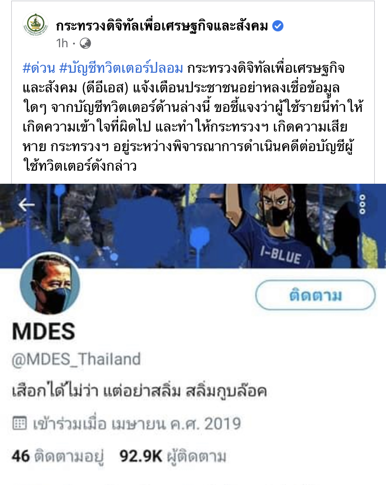 ผู้สื่อข่าวรายง เพจเฟซบุ๊ก กระทรวงดิจิทัลเพื่อเศรษฐกิจและสีงคม (ดีอีเอส ) โพสต์แจ้ง การใช้บัญชีทวิตเตอร์ชื่อเดียวกับกระทรวงฯ ว่า #บัญชีทวิตเตอร์ปลอม กระทรวงดิจิทัลเพื่อเศรษฐกิจและสังคม (ดีอีเอส) แจ้งเตือนประชาชนอย่าหลงเชื่อข้อมูลใดๆจากบัญชีทวิตเตอร์ด้านล่าง (ใช้ชื่อว่า MDES @MDES_Thailand (ซึ่งเป็นชื่อคล้ายกับชื่อย่อของกระทรวงดีอีเอส)) ขอชี้แจงว่าผู้ใช้รายนี้ทำให้เกิดความเข้าใจที่ผิดไป และทำให้กระทรวงฯ เกิดความเสียหาย กระทรวงฯ อยู่ระหว่างพิจารณาการดำเนินคดีต่อบัญชีผู้ใช้ทวิตเตอร์ดังกล่าว-สำนักข่าวไทย.
