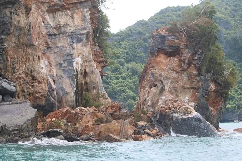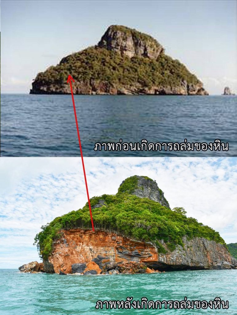นายปิยะ หนูนิล หัวหน้าอุทยานแห่งชาติหมู่เกาะอ่างทอง อ.เกาะสมุย จ.สุราษฎร์ธานี เปิดเผยว่า ตามที่ได้รายงานการตรวจพบการพังทลายของเขาหินปูนและดินถล่มบริเวณพื้นที่ด้านทิศตะวันตกเฉียงใต้ของเกาะหินแตก ที่พิกัด 47P 572232 1068005 เมื่อวันที่ 19 ก.ย.ที่ผ่านมา ซึ่งมีการถล่มลงในทะเลเป็นบริเวณกว้างประมาณ 15-20 % ของพื้นที่เกาะ จากการตรวจสอบสันนิษฐานว่าเกิดจากการเคลื่อนตัวของชั้นหินและชั้นดินที่ถูกกัดเซาะจากสถานการณ์ฝนตกหนักและคลื่นลมแรงจากสถานการณ์พายุโนอึลช่วง 1-2 วันที่ผ่านมา ดังนั้น การดำเนินการของอุทยานแห่งชาติหมู่เกาะอ่างทองในเบื้องต้นได้จัดเจ้าหน้าที่เฝ้าสังเกตุการณ์ เพราะอาจถล่มเพิ่มได้ รวมทั้งจะสำรวจความเสียหายและขนาดพื้นที่ที่ได้รับผลกระทบ พร้อมกันนี้ได้ประชาสัมพันธ์แจ้งเตือนไม่ให้เดินเรือเข้าใกล้บริเวณดังกล่าว เพื่อความปลอดภัยและป้องกันอันตรายที่อาจจะเกิดขึ้น