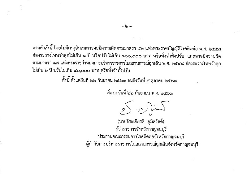 ทั้งนี้ ให้ระงับการใช้ช่องทางสำหรับนำเข้าหรือส่งออกสินค้า ห้ามเคลื่อนย้ายบุคคล หรือผู้ป่วยเข้ามาในทุกกรณี บริเวณจุดผ่อนปรนการค้าชายแดนบ้านพระเจดีย์สามองค์ (จุดผ่านแดนชั่วคราวเพื่อการท่องเที่ยว) และตามช่องทางธรรมชาติที่ติดต่อกับประเทศเมียนมาร์ทุกช่องทาง โดยให้เจ้าหน้าที่เพิ่มความเข้มงวดในการตรวจตรากฎขันอย่างเต็มที่ หากผู้ใดฝ่าฝืนโดยไม่มีเหตุอันสมควร จะมีความผิด ตามมาตรา 52 แห่งพระราชบัญญัติโรคติดต่อ พ.ศ.2558 ต้องระวางโทษจำคุกไม่เกิน 1 ปี หรือปรับไม่เกินหนึ่งแสนบาท หรือทั้งจำทั้งปรับ และอาจมีความผิดตามมาตรา 18 แห่งพระราชกําหนดการบริหารราชการในสถานการณ์ฉุกเฉิน พ.ศ.2548 ต้องระวางโทษจำคุกไม่เกิน 2 ปี ปรับไม่เกิน 40,000 บาท หรือทั้งจำทั้งปรับ