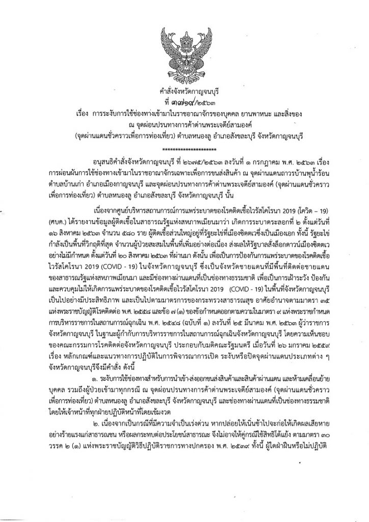นายจีระเกียรติ ภูมิสวัสดิ์ ผู้ว่าราชการจังหวัดกาญจนบุรี ลงนามหนังสือคำสั่งจังหวัดกาญจนบุรีฉบับที่ 3719/2563 เรื่องระงับช่องทางการใช้เข้ามาในราชอาณาจักร ของบุคคล ยานพาหนะ และสิ่งของ บริเวณจุดผ่อนปรนทางการค้าบ้านพระเจดีย์สามองค์ (จุดผ่านแดนชั่วคราวเพื่อการท่องเที่ยว) ต.หนองลู อ.สังขละบุรี เป็นเวลา 14 วัน ตั้งแต่วันที่ 22 ก.ย.-5 ต.ค. 2563 เนื่องจากศูนย์บริหารสถานการณ์การแพร่ระบาดของโรคติดเชื้อไวรัสโคโรนา 2019 (โควิด-19) แจ้งข้อมูลผู้ติดเชื้อในพื้นที่เมียนมาว่าเกิดการระบาดระลอก 2 ตั้งแต่วันที่ 16 ส.ค.2563 ผู้ติดเชื้อส่วนใหญ่อยู่ที่รัฐยะไข่ที่เมืองชิตตเว ซึ่งเป็นเมืองเอก และรัฐยะไข่กำลังเป็นพื้นที่วิกฤติ ส่งผลให้รัฐบาลเมียนมาล็อกดาวน์เมืองชิตตเวอย่างไม่มีกำหนด ดังนั้น เพื่อเป็นการป้องกันโรค และจังหวัดกาญจนบุรีเป็นจังหวัดมีพื้นที่ติดชายแดนกับเมียนมา รวมถึงช่องทางธรรมชาติ จึงต้องเฝ้าระวังและควบคุมไม่ให้มีการแพร่ระบาดของโรคในพื้นที่กาญจนบุรีให้เป็นไปอย่างมีประสิทธิภาพและตามมาตรการกระทรวงสาธารณสุข ผู้ว่าราชการจังหวัดกาญจนบุรีในฐานะผู้กำกับการบริหารราชการในสถานการณ์ฉุกเฉินจังหวัด โดยความเห็นชอบของคณะกรรมการโรคติดต่อจังหวัดจึงพิจารณาและมีคำสั่งระงับหรือปิดจุดผ่านแดน