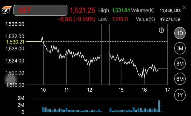 ตลท. 14 ธ.ค. – ผู้สื่อข่าวรายงานว่าดัชนีตลาดหลักทรัพย์ฯ วันนี้ปิดที่ระดับ 1,521.25 จุด ลดลง 8.96 จุด หรือร้อยละ 0.59 มูลค่าการซื้อขาย 49,271.74 ล้านบาท โดยดัชนีเคลื่อนไหวแดนลบเป็นส่วนใหญ่ แตะจุดสูงสุด 1,531.84จุด และแตะจุดต่ำสุดที่ระดับ 1,518.11 จุด