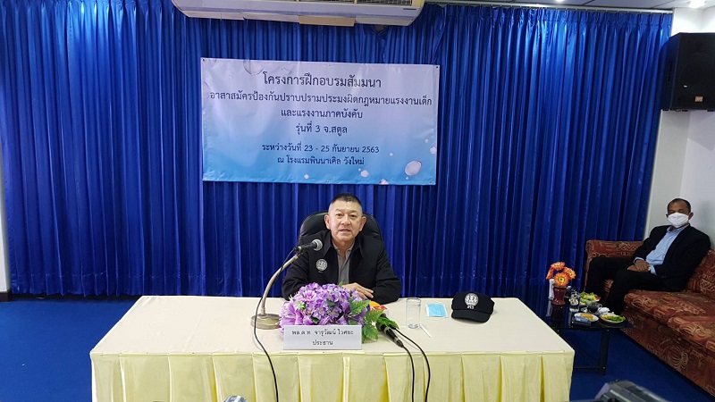 วันนี้ (26 ก.ย.63) เวลา 9.00 น. พล.ต.ท.จารุวัฒน์ ไวศยะ ผู้ช่วย ผบ.ตร. / ผอ.ศพดส.ตร. / รอง ผบ.สบนร. เปิดเผยว่า พล.อ.ประวิตร วงษ์สุวรรณ รองนายกรัฐมนตรี และ พล.ต.อ.จักรทิพย์ ชัยจินดา ผบ.ตร. ได้สั่งการให้ตนเองเดินทางมาเป็นประธานเปิดการฝึกอบรมอาสาสมัครป้องกันและปราบปรามประมงผิดกฎหมาย แรงงานเด็ก และแรงงานบังคับ รุ่นที่ 3 ระหว่างวันที่ 23-25 ก.ย.63 จว.สตูล เพื่อเผยแพร่ความรู้กฎหมายที่เกี่ยวข้อง เสนอแนะเทคนิค วิธีการ และการประสานงานกับหน่วยงานของรัฐ แลกเปลี่ยน ระดมความคิดเห็นของอาสาสมัครภาคประชาชน พื้นที่ชายฝั่งทะเล โดยมีผู้เข้ารับการฝึกอบรม ประกอบด้วย ประมงจังหวัด เจ้าหน้าที่ประมง และชาวประมงพื้นบ้านใน จว.สตูล จำนวน 90 คน ทั้งนี้ ได้แถลงข่าว และตอบข้อซักถามของชาวประมงในพื้นที่ด้วย ณ โรงแรมพินนาเคิล จว.สตูล. รวมทั้ง เปิดการฝึกอบรมอาสาสมัครป้องกันและปราบปรามประมงผิดกฎหมาย แรงงานเด็ก และแรงงานบังคับ รุ่นที่ 2 ระหว่างวันที่ 23-25 ก.ย.63 จว.สงขลา โดยมีผู้เข้ารับการฝึกอบรม ประกอบด้วย ประมงจังหวัด เจ้าหน้าที่ประมง และชาวประมงพื้นบ้านใน จว.สงขลา จำนวน 89 คน ณ โรงแรมลีการ์เด้น พลาซ่า จว.สงขลา