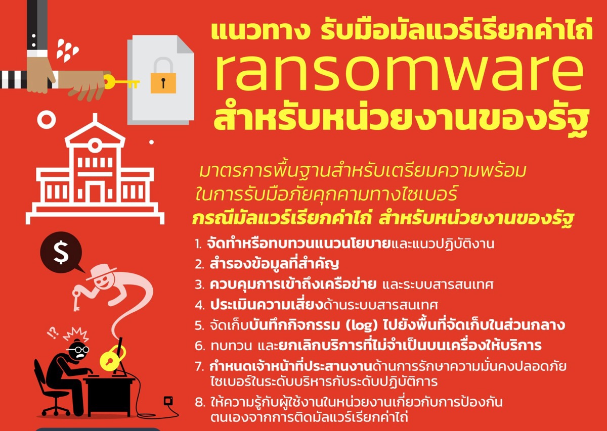 นายชัยชนะ มิตรพันธ์ ผู้อำนวยการสำนักงานพัฒนาธุรกรรมทางอิเล็กทรอนิกส์ (สพธอ.) หรือ เอ็ตด้ากล่าวว่า อาศัยอำนาจตามมาตรา 5 แห่งพระราชบัญญัติสำนักงานพัฒนาธุรกรรมทางอิเล็กทรอนิกส์ พ.ศ. 2562 ออกประกาศสำนักงานฯ เรื่อง แนวปฏิบัติในการรับมือเหตุการณ์ภัยคุกคามทางไซเบอร์เกี่ยวกับมัลแวร์เรียกค่าไถ่ (Ransomware) สำหรับหน่วยงานรัฐ เพื่อให้หน่วยงานรัฐใช้เป็นแนวทางในการดำเนินการรับมือ ป้องกันภัยคุกคามทางไซเบอร์ของมัลแวร์เรียกค่าไถ่ (Ransomware) โดยประกาศดังกล่าวจะครอบคลุมเนื้อหารายละเอียด 2 ส่วน ส่วนแรก: มาตรการพื้นฐาน 8 เรื่องสำคัญ สำหรับเตรียมความพร้อมในการรับมือภัยคุกคามทางไซเบอร์ กรณีมัลแวร์เรียกค่าไถ่ สำหรับหน่วยงานของรัฐ การจัดทำหรือทบทวนแนวนโยบายและแนวปฏิบัติในการรักษาความมั่นคงปลอดภัยด้านสารสนเทศของหน่วยงาน ให้ครอบคลุมการสำรองข้อมูล การควบคุมการเข้าถึงเครือข่ายและระบบสารสนเทศ และการประเมินความเสี่ยง