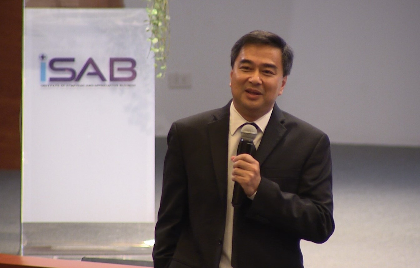 นายอภิสิทธิ์ เวชชาชีวะ อดีตนายกรัฐมนตรีและหัวหน้าพรรคประชาธิปัตย์ บรรยายพิเศษเรื่อง ยุคใหม่ เศรษฐศาสตร์ใหม่ ให้กับนักศึกษา The Master รุ่นที่ 1 สถาบัน iSAB ตอนหนึ่งว่า ตลอดระยะเวลา 2 ปีที่ผ่านมารัฐบาลชุดปัจจุบันได้มีมาตรการกระตุ้นเศรษฐกิจหลายโครงการ แต่ก็พบว่าเศรษฐกิจก็ยังไม่ดีขึ้น ปัจจัยส่วนหนึ่งเกิดจากภาคการเกษตรประสบปัญหาภัยแล้งติดต่อกันเกษตรกรสูญเสียรายได้ ขณะที่ชาวนาถูกยกเลิกโครงการรับจำนำข้าวทำให้ส่วนต่างของรายได้ลดลงเกือบเท่าต้นทุน แม้ว่าโครงการรับจำนำข้าวจะไม่ดีแต่ก็มีผลกระทบอย่างมากต่อรายได้ของชาวนา ซึ่งความน่ากลัวของเศรษฐกิจยุคใหม่ คือ รายได้ภาคการเกษตร กับ ผู้ประกอบธุรกิจรายใหญ่ ที่มีความต่างของเงินทุน ส่วนการที่รัฐบาลเน้นเรื่องการขับเคลื่อนเศษฐกิจดิจิทัล หรือ ประเทศไทย 4.0 นั้น ต้องมองว่ากำลังทุ่มเทกับเรื่องนี้มากเกินไปหรือไม่ ขีดความสามารถของกลุ่มแรงงานสอดคล้องกับนโยบายหรือไม่ ต้องไม่มองเพียงภาพรวมอย่างเดียว