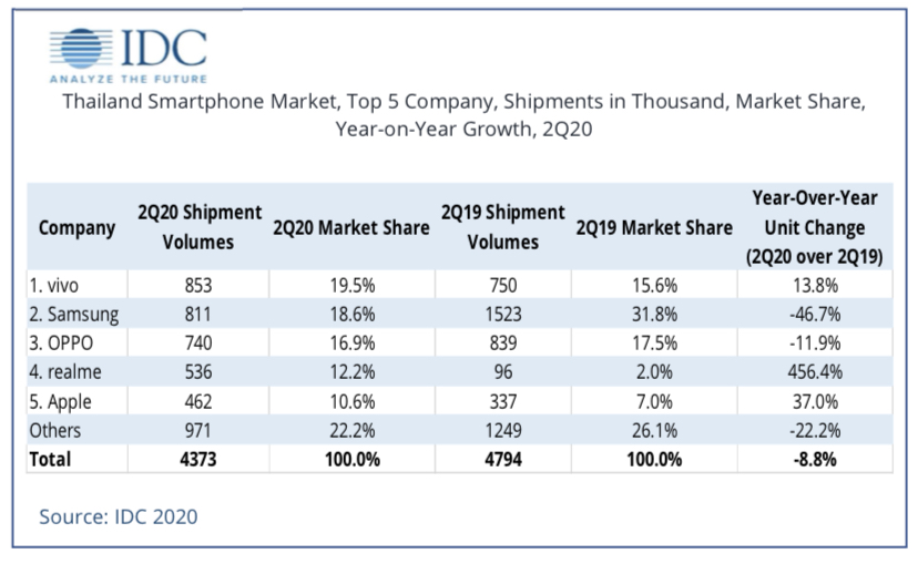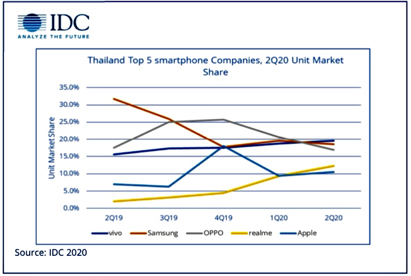 ทั้งนี้ภาพรวม 5 แบรนด์ที่ครองสัดส่นการตลาด 5 อันดับแรก คือ อันดับหนึ่งวีโว่ ที่ครองอันดับหนึ่งเพราะเน้นไปที่สมาร์ทโฟนรุ่นกลาง ซัมซุง ยังคงเป็นผู้นำตลาดลำดับสองที่ทำตลาดด้วยกาแลคซี่ รุ่นเอ ออปโป้ ที่เสียอันดับหนึ่งในไตรมาสที่สองเรืองจากราคาขึ้ในบางช่วงรุ่นที่เปิดตัวใหม่ เรียลมี มาแทนที่หัวเว่ยในอันดับ 4 มือถือรุ่นเล็กยังคงได้รับการเตอบรับ และการเสริมสร้างภาพลักษณ์กับ 5G แอปเปิ้ล ยงครองอันดับ 5 เนื่องจากไอโฟนเอสอี ที่ด้รับความนิยมในช่วงโควิด–19 โดยไอโฟน11ยังคงเป็นรุ่นที่ได้รับความนิยมสูงสุด -สำนักข่าวไทย.