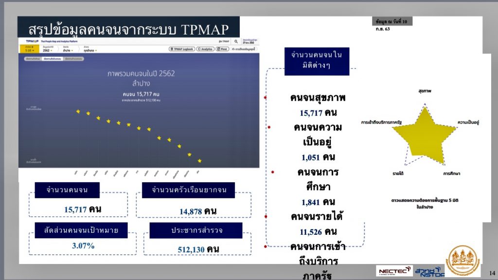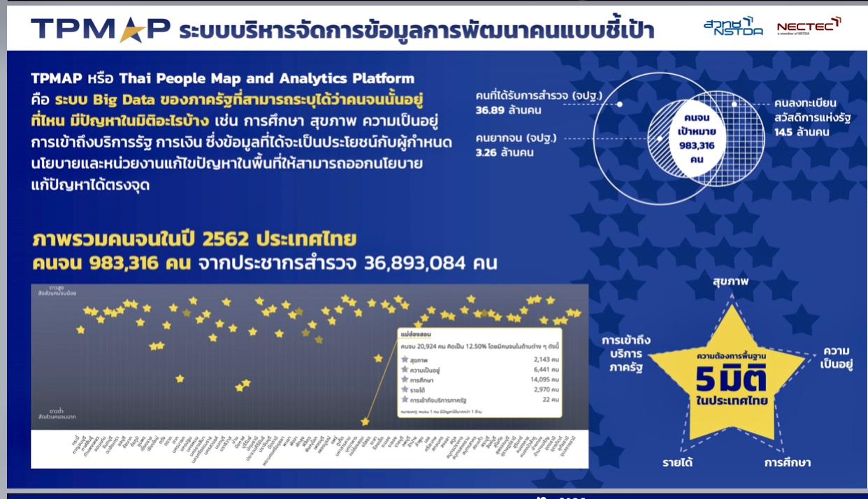 สำนักงานคณะกรรมการพัฒนาเศรษฐกิจและสังคมแห่งชาติ (สศช.) และ ศูนย์เทคโนโลยีอิเล็กทรอนิกส์และคอมพิวเตอร์แห่งชาติ (เนคเทค-สวทช.) กระทรวงวิทยาศาสตร์และเทคโนโลยี ได้พัฒนาระบบจัดการข้อมูลการพัฒนาคนแบบชี้เป้า หรือ TPMAP ระบบที่พัฒนาต่อยอดมาจากระบบบริหารจัดการข้อมูลคนจนแบบชี้เป้า (Thai People Map and Analytics Platform)โดยใช้ข้อมูลจำเป็นพื้นฐานของกรมการพัฒนาชุมชน และข้อมูลผู้ลงทะเบียน สวัสดิการแห่งรัฐของกระทรวงการคลัง และใช้วิธีการประมวลข้อมูลเพื่อดูความยากจนในหลายมิติ โดยสศช. ได้น่ามาปรับใช้กับประเทศไทย ให้สามารถครอบคลุมปัญหาที่กว้างขึ้น เช่น เด็กแรกเกิด การศึกษา ผู้สูงอายุ การพัฒนาสภาพที่อยู่อาศัย โดยยังคงความสามารถของระบบเดิมในการชี้เป้าความยากจนไว้ด้วย