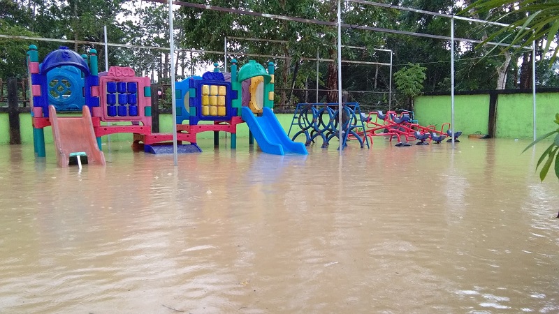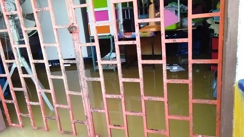 สตูล 13 ต.ค.- สตูลฝนตกน้ำท่วมศูนย์พัฒนาเด็กเล็ก อบต.น้ำผุด สั่งปิดชั่วคราว ครูเร่งขนอุปกรณ์การเรียนขึ้นที่สูง ขณะที่บ้านเรือนถูกลมพายุพัดหลังคาเสียหาย 11 หลัง