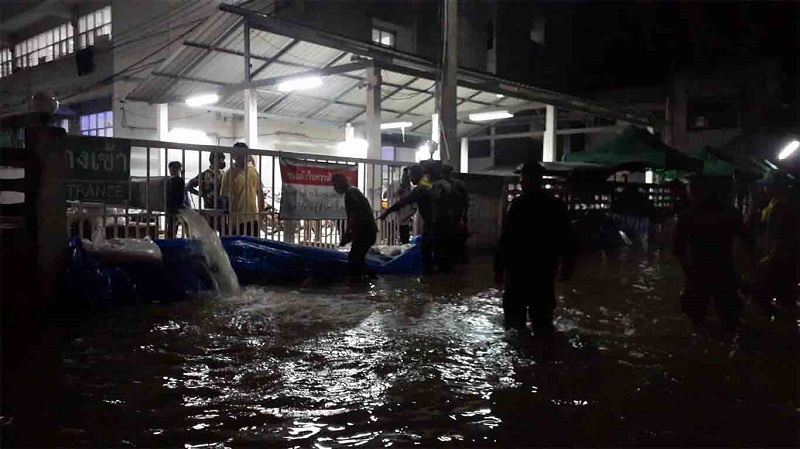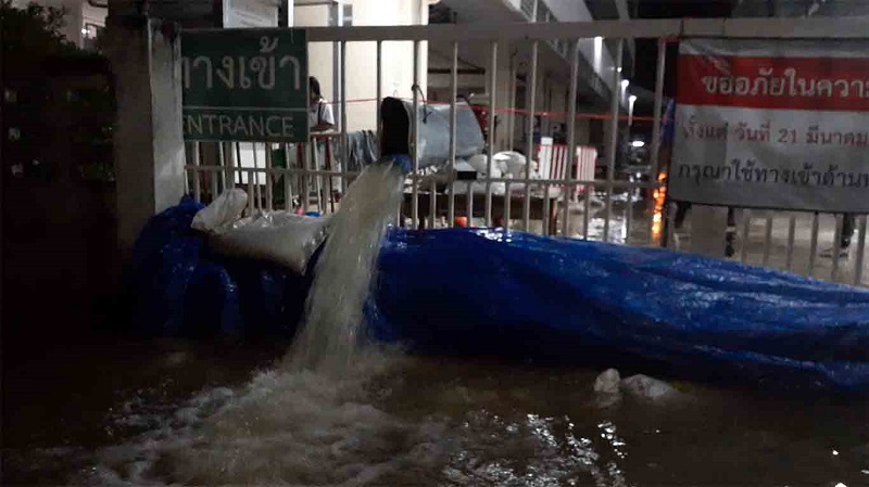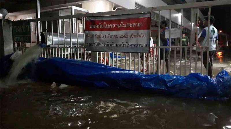 สระแก้ว 19 ต.ค.- รพ.อรัญประเทศ เร่งวางกระสอบทรายป้องกันน้ำท่วมที่ผุดขึ้นตามท่อระบายน้ำ พร้อมสูบน้ำระบายออก “นพ.ราเชษฎ” ผอ.รพ.ระบุยังไม่กระทบกับการบริการทางการแพทย์ และรับมือได้