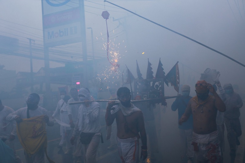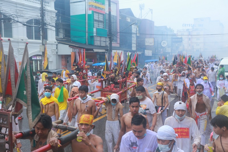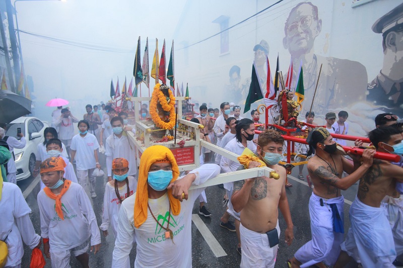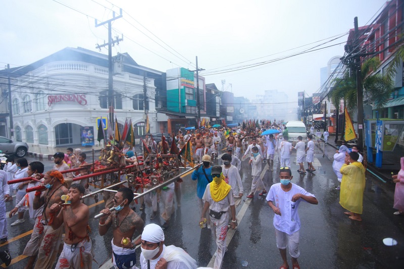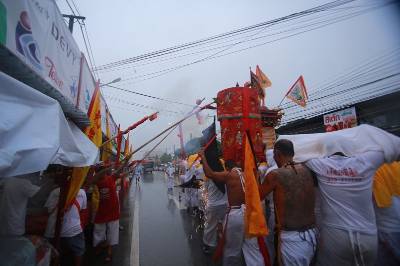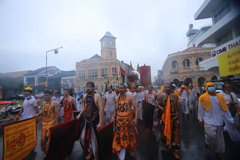 บรรยากาศงานประเพณีถือศีลกินผักจังหวัดภูเก็ต ประจำปี 2563 ที่เริ่มมาตั้งแต่วันที่ 17 ต.ค. ซึ่งวันนี้ (25 ต.ค.) เป็นวันสุดท้ายของงาน มีการประกอบพิธีแห่พระรอบเมืองของศาลเจ้า หรืออ๊าม แม้มีฝนตกลงมาอย่างต่อเนื่อง แต่เส้นทางที่ขบวนแห่พระของศาลเจ้าซุ่ยบุ๋นต่องหรือศาลเจ้าหล่อโรง แห่ผ่านยังคงหนาแน่นไปด้วยประชาชนที่ออกมาตั้งโต๊ะเครื่องบูชาขอพร
