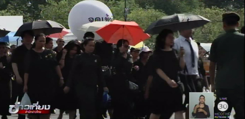 บรรยากาศที่ท้องสนามหลวง ตลอดช่วงเช้าวันนี้ มีประชาชนทยอยมากราบถวายบังคมพระบรมศพ พระบาทสมเด็จพระปรมินทรมหาภูมิพลอดุลยเดช ณ พระที่นั่งดุสิตมหาปราสาท ในพระบรมมหาราชวัง อย่างต่อเนื่อง โดยเจ้าหน้าที่สำนักพระราชวังเปิดให้คิวแรกเข้าไปกราบถวายบังคมตั้งแต่เวลา 05.00 น. ขณะนี้ปล่อยแถวประชาชนเข้ากราบถวายบังคมพระบรมศพ ได้แล้ว 15,000 คน ขณะที่ท้ายคิวช่วงเที่ยงวันนี้ อยู่ด้านหน้าพิพิธภัณฑสถานแห่งชาติ และหลังทดลองแจกบัตรลาคิวในช่วง 7 วันที่ผ่านมา รวมทั้งจัดเจ้าหน้าที่ประจำตามเต็นท์ต่างๆ เพื่อป้องกันปัญหาการแทรกคิว ซึ่งสามารถแก้ปัญหาได้เป็นอย่างดี. – สำนักข่าวไทย