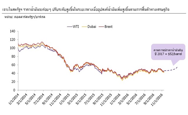 อีไอซีมองว่าราคาน้ำมันยังถูกกดดันจากอุปทานน้ำมันที่จะสูงขึ้นอีกมากในสหรัฐระยะกลางราคาน้ำมันมีแนวโน้มสูงขึ้นตามการฟื้นตัวของอุปสงค์น้ำมันและเศรษฐกิจโลก การปรับเพิ่มขึ้นของราคาน้ำมันระยะสั้นยังค่อนข้างจำกัด เนื่องจากการลงทุนขุดเจาะน้ำมันที่ได้รับแรงกระตุ้นจากนโยบายของทรัมป์จะยิ่งทำให้อุปทานน้ำมันล้นตลาดมากขึ้นอีก เว้นแต่ว่าจะมีเรื่องการคว่ำบาตรอิหร่านที่จะทำให้ราคาน้ำมันทะยานสูงขึ้นได้ ระยะกลางคาดว่าราคาน้ำมันจะค่อย ๆ ปรับระดับสูงขึ้น จากปัจจัยด้านอุปสงค์น้ำมันที่เร่งขึ้นมาทันกับอุปทาน โดยมาตรการกระตุ้นเศรษฐกิจ การลดภาษี นโยบายสนับสุนนภาคธุรกิจ การใช้จ่ายในโครงการก่อสร้างโครงสร้างพื้นฐาน เช่น ถนน สนามบิน รวมถึงการผ่อนคลายกฎระเบียบด้านสิ่งแวดล้อมของทรัมป์ จะผลักดันให้มีความต้องการใช้น้ำมันสูงขึ้น ทั้งนี้ อีไอซีประเมินราคาน้ำมันปี 2017 จะอยู่ที่ระดับประมาณ 52 ดอลลาร์สหรัฐ/บาร์เรล