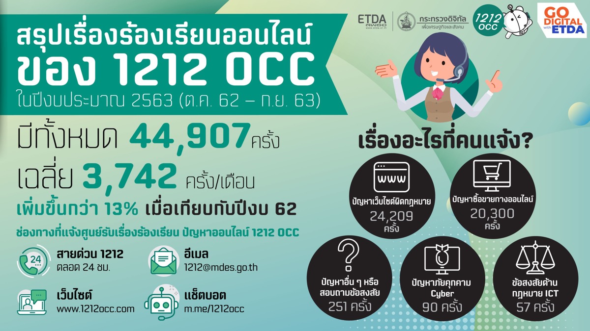 นายชัยชนะ มิตรพันธ์ ผู้อำนวยการสำนักงานพัฒนาธุรกรรมทางอิเล็กทรอนิกส์ (สพธอ.) หรือ (เอ็ตด้า) กล่าวว่า ศูนย์รับเรื่องร้องเรียนปัญหาออนไลน์ 1212 OCC หรือ Online Complaint Center ที่ทำหน้าที่เป็นตัวกลางรับเรื่องร้องเรียนปัญหาออนไลน์ รายงานการรับเรื่องร้องเรียนพบว่า มีผู้บริโภคเข้ามาร้องเรียนผ่านช่องทางสายด่วน 1212, อีเมล 1212@mdes.go.th , เว็บไซต์www.1212occ.com และแช็ตบอต m.me/1212occ เพิ่มขึ้นจากปีที่ผ่านมา ร้อยละ 13 จำนวนรวมกว่า 44,907 ครั้ง เฉลี่ย3,742 ครั้งต่อเดือน โดยปัญหาออนไลน์ที่พบมากที่สุดคือ ปัญหาการซื้อขายทางออนไลน์ จำนวน 20,300 ครั้ง รองลงมาคือ ปัญหาเว็บไซต์ผิดกฎหมาย 24,209 ครั้ง ปัญหาภัยคุกคามทางไซเบอร์ 90 ครั้ง ข้อสงสัยด้านกฎหมายไอซีที 57 ครั้ง และปัญหาอื่น อาทิ สอบถามข้อสงสัย 251 ครั้ง