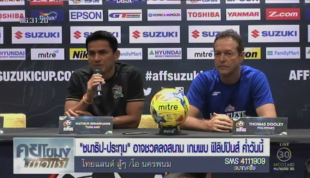 “ซิโก้” เกียรติศักดิ์ เสนาเมือง หัวหน้าผู้ฝึกสอนทีมชาติไทย ร่วมแถลงข่าวก่อนเกมนัดที่ 3 ของกลุ่มเอ ในศึกฟุตบอลชิงแชมป์อาเซียน 2016 เอเอฟเอฟ ซูซูกิคัพ ที่โรงแรมมาร์โค โปโล ออร์ติกา มะนิลา ประเทศฟิลิปปินส์ โดยทีมชาติไทยผ่านเข้ารอบรองชนะเลิศเป็นแชมป์กลุ่มแน่นอนแล้ว หลังจากเอาชนะ อินโดนีเซีย 4-2 และ ชนะ สิงคโปร์ 1-0 มี 6 คะแนนเต็ม