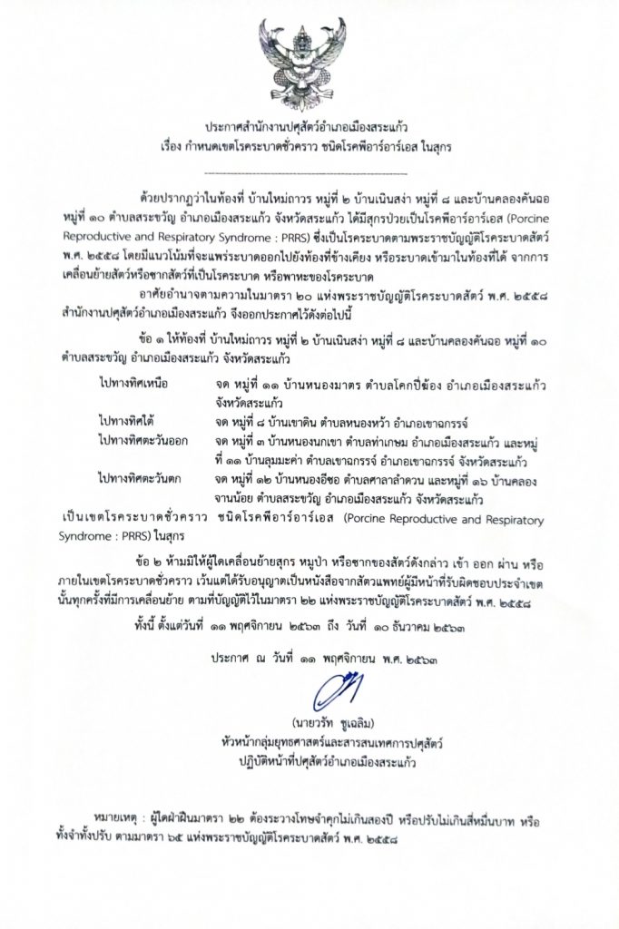 นายประสิทธิ์ ต้อยติ่ง ปศุสัตว์จังหวัดสระแก้ว เปิดเผยถึงสถานการณ์ระบาดของไวรัสพีอาร์อาร์เอส ในสุกรขณะนี้ว่า ล่าสุด (11 พ.ย.) สำนักงานปศุสัตว์อำเภอเมืองสระแก้ว ได้ประกาศเขตโรคระบาดชั่วคราวเพิ่มอีกในพื้นที่ อ.เมือง คือ หมู่ 2 บ้านใหม่ถาวร, หมู่ 5 บ้านเนินสง่า และหมู่ 10 บ้านคลองคันฉอ ต.สระขวัญ โดยอาศัยอำนาจตามพระราชบัญญัติโรคระบาดสัตว์ พ.ศ.2558 เพื่อควบคุมการระบาดของโรค เนื่องจากมีแนวโน้มที่จะแพร่ระบาดออกไปยังพื้นที่ใกล้เคียงหรือระบาดเข้ามา ดังนั้น จึงห้ามเคลื่อนย้ายสัตว์หรือซากสัตว์เข้า-ออกชั่วคราว เว้นแต่ได้รับอนุญาตเป็นหนังสือจากสัตวแพทย์ผู้มีหน้าที่รับผิดชอบประจำเขตนั้นทุกครั้งที่มีการเคลื่อนย้าย ส่วนพื้นที่มีการประกาศโรคระบาดก่อนหน้านี้ คือ บางส่วนของ อ.เขาฉกรรจ์ และบางส่วนของ อ.เมือง ขณะเดียวกันเจ้าหน้าที่ได้ตั้งด่านตรวจเฝ้าระวังการเคลื่อนย้ายสัตว์ โดยมีหน่วยงานของสารวัตรกรมปศุสัตว์ ตั้งจุดสกัดการเคลื่อนย้ายสัตว์เข้าออกพื้นที่ เริ่มตั้งแต่วันนี้ (11 พ.ย.) หากผู้ใดฝ่าฝืนจะมีโทษ ซึ่งการเคลื่อนย้ายโดยไม่ได้รับอนุญาต ผู้ฝ่าฝืนจะมีโทษตามมาตรา 22 และมาตรา 65 จำคุกไม่เกิน 2 ปี ปรับไม่เกิน 40,000 บาท