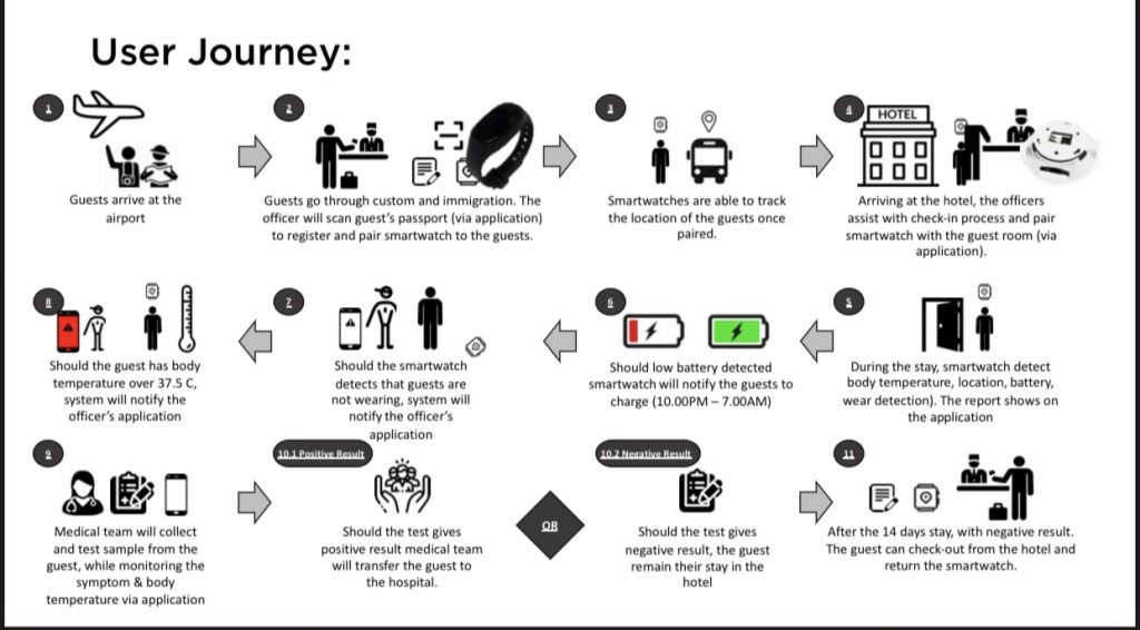 “เมื่อนักท่องเที่ยวเดินทางผ่านด่านตรวจคนเข้าเมือง(ตม.)จะเข้าพักในโรแรมทร่เป็น State Quarentine เป็นเวลา 14 วัน นักท่องเที่ยวจะได้รับสายรัดข้อมือที่มีอุปกรณ์เก็บข้อมูลทางสุขภาพของนักท่องเที่ยว อุปกรณ์จะส่งข้อมูลไปเก็บไว้ที้ dashboard (ระบบจัดเก็บและประมวลผลข้อมูล) เพื่อแสดงผลการติดตามสุขภาพของนักท่องเที่ยว ตัวรีสแบนด์ จะเก็บข้อมูลพื้นฐานทางสุขภาพ การเดิน การนอน และข้อมูลเกี่ยวกับอุณหภูมิของนักท่องเที่ยวซึ่งสำคัญมากกับการเฝ้าระวังโควิด-19 หากเกิดความผิดปกติระบบจะแจ้งเตือนนักท่องเที่ยว เพื่อให้เจ้าหน้าที่สาธารณสุขเข้ามาดูและ รวมถึงหากเกิดเหตุผิดปกตินักท่องเที่ยวสามารถกดปุ่มแจ้งเตือนได้ด้วยตัวเอง”