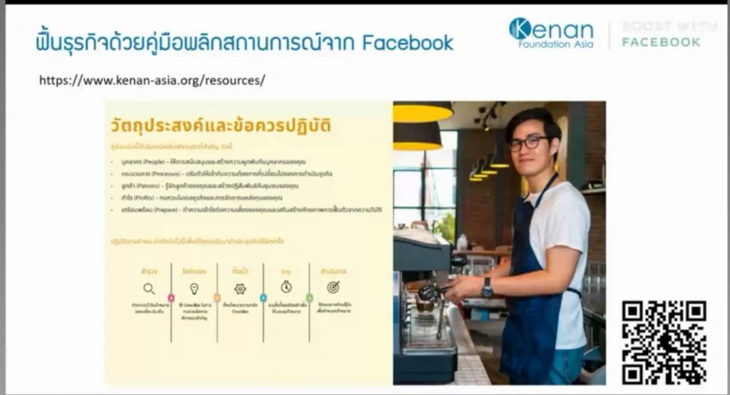 นางสาวเบธ แอน ลิม ผู้อำนวยการฝ่ายนโยบายโครงการเพื่อชุมชน ประจำ เฟสบุ๊ก เอเชียตะวันออกเฉียงใต้ กล่าวว่า ในขณะที่ธุรกิจในประเทศไทยกำลังปรับกลยุทธ์ให้เข้ากับสภาวะนิวนอร์มอล เรายังคงมุ่งมั่นที่จะให้ความช่วยเหลือธุรกิจเหล่านั้นในการฟื้นตัว และต้องทำให้แน่ใจว่าความพยายามของเราจะเข้าถึงคนทุกกลุ่มโดยไม่มีข้อแม้ ไม่ว่าพวกเขาจะมีความสามารถเพศวิถี และภูมิหลังด้านเศรษฐกิจและสังคมอย่างไร จากการดำเนินโครงการนี้ เราคาดหวังที่จะเป็นเหมือนสะพานเชื่อมเพื่อช่วยลดปัญหาช่องว่างทางทักษะ ด้วยการให้ความรู้ เสริมสร้างทักษะ และสนับสนุนธุรกิจขนาดกลางและขนาดย่อมในประเทศไทย และชุมชนที่มีความหลากหลาย รวมถึงช่วยเสริมสร้างศักยภาพการฟื้นตัวของกลุ่มคนที่มีความเสี่ยงมากที่สุดโดยเฉพาะในช่วงเวลาที่เราทุกคนกำลังก้าวผ่านผลกระทบจากการแพร่ระบาดของโควิด-19 ซึ่งเป็นสถานการณ์ระดับโลกความคืบหน้าของโครงการ Boost with Facebook เป็นการสร้างการมีส่วนร่วมของชุมชนจากทุกภาคส่วน ในช่วงใกล้สิ้นปีภายใต้ความร่วมมือกับมูลนิธิคีนันแห่งเอเซีย เพื่อให้ข้อมูลเกี่ยวกับผลลัพธ์ล่าสุดของโครงการฝึกอบรม Boost with Facebook ที่มีการดำเนินงานอย่างต่อเนื่อง ความร่วมมือยังรวมถึงการประกาศเปิดตัวคู่มือพลิกสถานการณ์เสริมสร้างศักยภาพการฟื้นตัวของธุรกิจขนาดย่อมที่ถูกจัดทำขึ้นใหม่ ซึ่งสอดคล้องกับความมุ่งมั่นของเฟสบุ๊กประเทศไทย ในการสนับสนุนธุรกิจขนาดย่อมที่ได้รับผลกระทบจากสถานการณ์การแพร่ระบาดโควิด-19 และการกระตุ้นการเปลี่ยนแปลงทางดิจิทัล