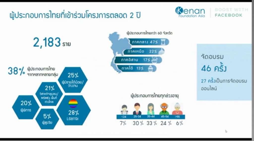 โครงการ Boost with Facebook ได้เสริมสร้างทักษะดิจิทัลที่จำเป็นให้แก่ธุรกิจขนาดกลางและขนาดย่อม รวมถึงผู้ประกอบการชาวไทย เพื่อช่วยผลักดันการเติบโตของธุรกิจของพวกเขา โดยช่วงที่ผ่านมาในปีนี้ การจัดฝึกอบรมในรูปแบบออนไลน์ภายใต้โครงการของเฟสบุ๊กซึ่งเปิดรับสมัครบุคคลทั่วไปโดยไม่มีค่าใช้จ่าย สามารถเข้าถึงคนไทยกว่า 2.3 ล้านคน นอกจากกลุ่มธุรกิจขนาดกลางและขนาดย่อมในประเทศไทยและบุคคลทั่วไปแล้ว เฟสบุ๊กยังได้ดำเนินงานร่วมกับมูลนิธิคีนันแห่งเอเซียและพันธมิตรชุมชนต่างๆ เพื่อให้แน่ใจว่าการจัดฝึกอบรมของโครงการสามารถเข้าถึงผู้ประกอบการที่มาจากชุมชนชายขอบที่มีความสำคัญ เพื่อมอบโอกาสในการสนับสนุนการเติบโตเชิงเศรษฐกิจแก่ชุมชนที่มีความหลากหลาย