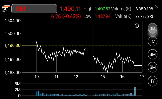 ตลท. 24 พ.ย. – ผู้สื่อข่าวรายงานว่าดัชนีตลาดหลักทรัพย์ปิดการซื้อขายที่ระดับ 1,490.11 จุด ลดลง 6.25 จุด หรือ ร้อยละ 0.42 มูลค่าการซื้อขาย 33,752.37 ล้านบาท โดยดัชนียังเคลื่อนไหวแดนลบ ต่ำสุดที่ระดับ 1,487.94 จุด และสูงสุดของวันที่ระดับ 1,497.62 จุด