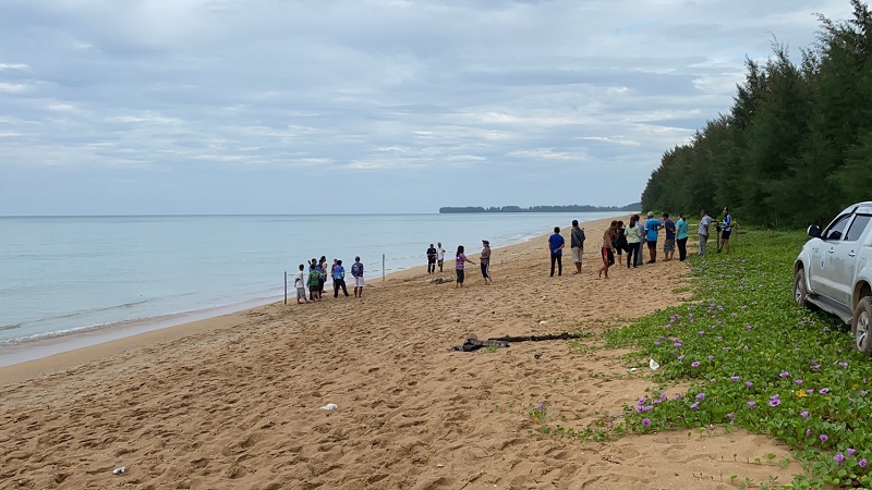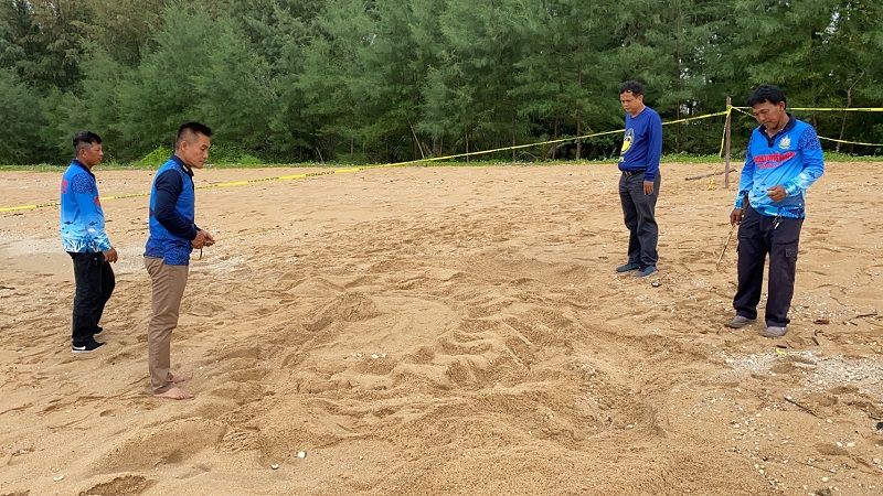 นายจำรัส หลีเจี้ย กำนันตำบลคึกคัก อ.ตะกั่วป่า จ.พังงา ประสานศูนย์เฝ้าระวังและติดตามสถานการณ์เต่ามะเฟือง เพื่อลงพื้นที่ตรวจพิสูจน์บริเวณชายหาดคึกคัก หลังได้รับแจ้งจากชาวประมงพื้นบ้านที่กำลังจะออกหากุ้งเคยว่าพบรอยอาจเป็นเต่าทะเลตัวใหญ่ขึ้นมาวางไข่