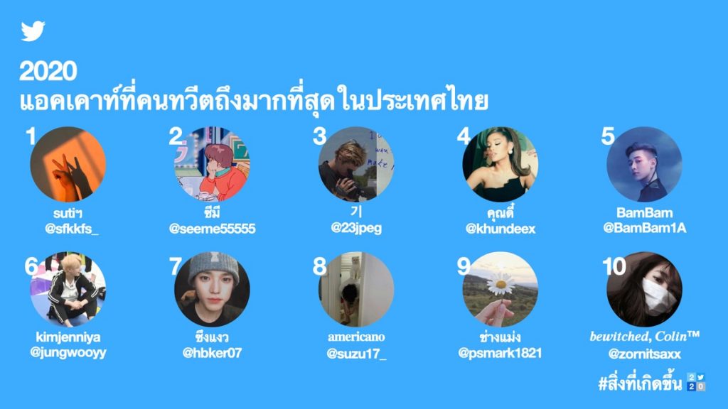 แอคเคาท์ที่คนทวีตถึงมากที่สุดในประเทศไทยในปีนี้มีการเติบโตทั้งการสนทนา ชุมชน และผู้คนที่หลากหลายมากขึ้นบนทวิตเตอร์ แอคเคาท์ที่มีการทวีตถึงมากที่สุดในปี้นี้แสดงให้เห็นว่าคนทั่วไปล้วนเป็นกระบอกเสียงบนทวิตเตอร์ โดยจาก 9 ใน 10 ของแอคเคาท์มีการทวีตถึงมากที่สุดเป็นแอคเคาท์ทั่วไปไม่ได้ขึ้นอยู่กับจำนวนของฟอลโลเวอร์ แต่ขึ้นอยู่กับความเกี่ยวข้องกับเรื่องนั้นๆ ที่ตรงกัน ทวิตเตอร์จึงเป็นสถานที่ที่ผู้คนสามารถเห็นบทสนทนาในทุกด้านและเชื่อมโยงระหว่างกันได้-สำนักข่าวไทย.