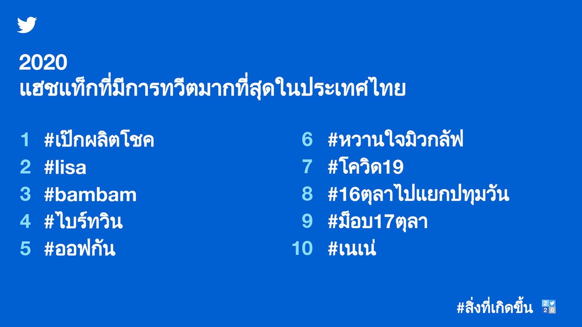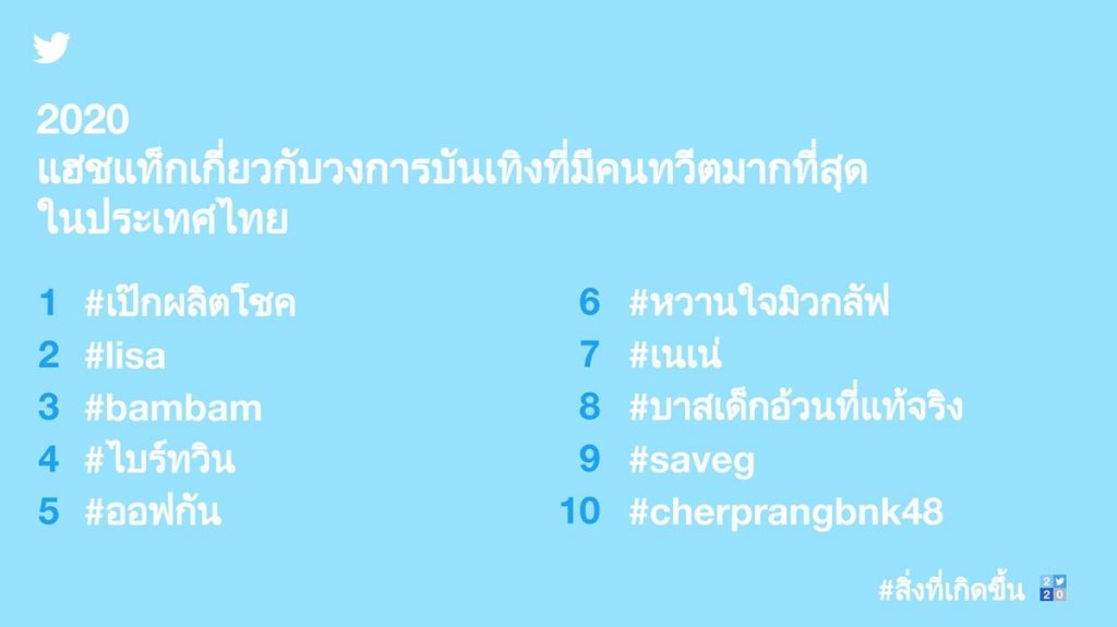 แฮชแท็กที่มีการทวีตมากที่สุดในประเทศไทย แฮชแท็กกลายเป็นเครื่องมือที่ทรงพลังเพื่อทำให้ผู้คนและชุมชนต่างๆมารวมตัวกัน ขับเคลื่อนบทสนทนาและแบ่งปันข้อมูลที่สำคัญ แฮชแท็กศิลปินที่มีการทวีตถึงมากที่สุดในปี 2563 คือ เป๊ก ผลิตโชค (#เป๊กผลิตโชค) ลิซ่า แบล็กพิงก์ (#lisa) และ แบมแบม GOT7 (#bambam) โดยเทรนด์ใหม่ในปีนี้คือการเติบโตของบทสนทนาที่เกี่ยวกับนักแสดงซีรีส์วาย รวมถึงแฮชแท็กที่เกี่ยวกับการเคลื่อนไหวทางสังคม นอกจากนี้ปี 2563 ยังเป็นปีที่มีข่าวใหญ่ๆ เกิดขึ้นหลายเรื่องบนทวิตเตอร์จนกลายเป็นข่าวดัง และข่าวที่อัปเดตสถานการณ์แบบเรียลไทม์ จึงไม่น่าแปลกใจหากว่า #โควิด19 จะเป็นแฮชแท็กที่มีคนทวีตถึงมากที่สุดเป็นอันดับ 7 ของแฮชแท็กที่มีการทวีตมากที่สุดในประเทศไทย ในปีนี้ #covid19 (และแฮชแท็กเรื่องเดียวกัน) คือแฮชแท็กที่ถูกทวีตทั่วโลกไปเกือบ 400 ล้านทวีต และเป็นแฮชแท็กที่ทำให้เราพูดถึงหัวข้ออื่นๆ เปลี่ยนแปลงไปจากเดิม
