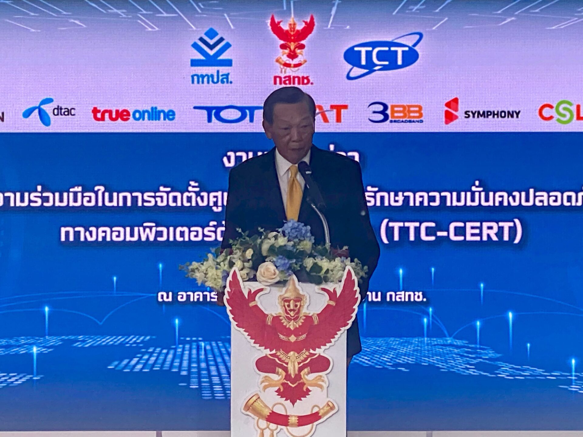 พลเอก สุกิจ ขมะสุนทรประธานคณะกรรมการกิจการกระจายเสียง กิจการโทรทัศน์ และกิจการโทรคมนาคมแห่งชาติ (กสทช.) นายไตรรัตน์ วิริยะศิริกุล รองเลขาธิการ รักษาการเลขาธิการกสทช. นายวิเชาวน์ รักพงษ์ไพโรจน์ นายกสมาคมโทรคมนาคมแห่งประเทศไทยในพระบรมราชูปถัมภ์ (สทค) นายสืบศักดิ์ สืบภักดี เลขาธิการ สมาคมโทรคมนาคมฯพร้อมทั้งนายวีระ รัตนแสงเสถียร หัวหน้าคณะทำงานดำเนินการศูนย์รักษาความปลอดภัยระบบคอมพิวเตอร์ด้านโทรคมนาคม (TTC-CERT) แถลงถึงความร่วมมือในข้อตกลงระหว่างสมาคมโทรคมนาคมแห่งประเทศไทย ในพระบรมราชูปถัมภ์ร่วมกับผู้ให้บริการโทรคมนาคม9 รายในการจัดตั้งศูนย์ประสานงานรักษาความมั่นคงปลอดภัยทางคอมพิวเตอร์ด้านโทรคมนาคม (TTC-CERT)โดยทีทีซีเซิร์ทได้รับทุนสนับสนุนในการจัดตั้งจาก กสทชตามพ.ร.บ.การรักษาความมั่นคงปลอดภัยไซเบอร์พ.ศ. 2562 ที่มีผลบังคับใช้แล้ว ในการทำให้เกิดความมั่นคงปลอดภัยไซเบอร์ ในการให้บริการโทรคมนาคม ให้มีความมั่นคงปลอดภัยในการบริการผู้ใช้งาน และยังเป็นการพัฒนากิจการโทรคมนาคม ของประเทศไทยให้มีความเจริญก้าวหน้า สามารถก้าวทันเทคโนโลยีที่พัฒนาไปอย่างรวดเร็ว และมีมาตรฐานในด้านความมั่นคงปลอดภัยเป็นที่ยอมรับในระดับสากล