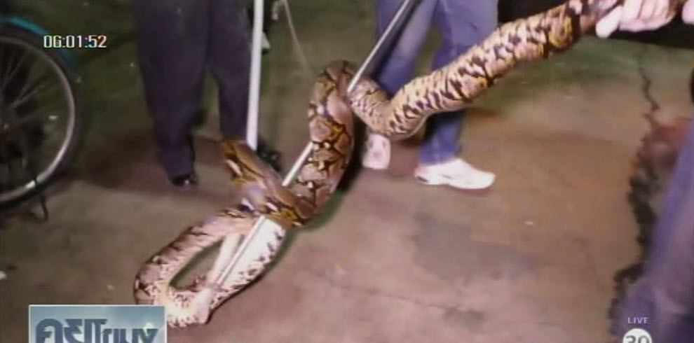 ฉะเชิงเทรา 24 พ.ย. – งูเหลือมยาว 4 เมตร แอบเลื้อยเข้าบ้านที่ จ.ฉะเชิงเทรา แล้วหลบใต้ตู้เสื้อผ้า พุ่งกัดเท้าหญิงเจ้าของบ้าน