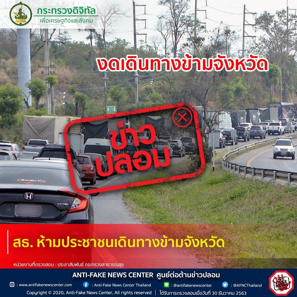จากกรณีที่มีการแชร์ภาพพร้อมข้อความว่า งดเดินทาง หรือ ห้ามประชาชนเดินทางข้ามจังหวัดนั้น สร้างความตื่นตระหนกให้ประชาชน นายพุทธิพงษ์ ปุณณกันต์ รัฐมนตรีว่าการกระทรวงดิจิทัลเพื่อเศรษฐกิจและสังคม(ดีอีเอส) ยืนยันว่า เรื่องนี้ทางศูนย์ต่อต้านข่าวปลอมได้ตรวจสอบกับศูนย์บริหารสถานการณ์แพร่ระบาดของโรคติดเชื้อไวรัสโคโรนา 2019 (ศบค.) ได้ชี้แจงว่า ขณะนี้ยังไม่มีการประกาศห้ามหรืองดการเดินทางข้ามจังหวัดแต่อย่างใด มีเพียงการขอความร่วมมือจากประชนให้งดการเดินทางที่ไม่จำเป็น เพื่อไม่ให้เป็นการเดินทางกลับเหมือนสถานการณ์ปกติและป้องกัน และลดโอกาสการแพร่เชื้อโควิด-19