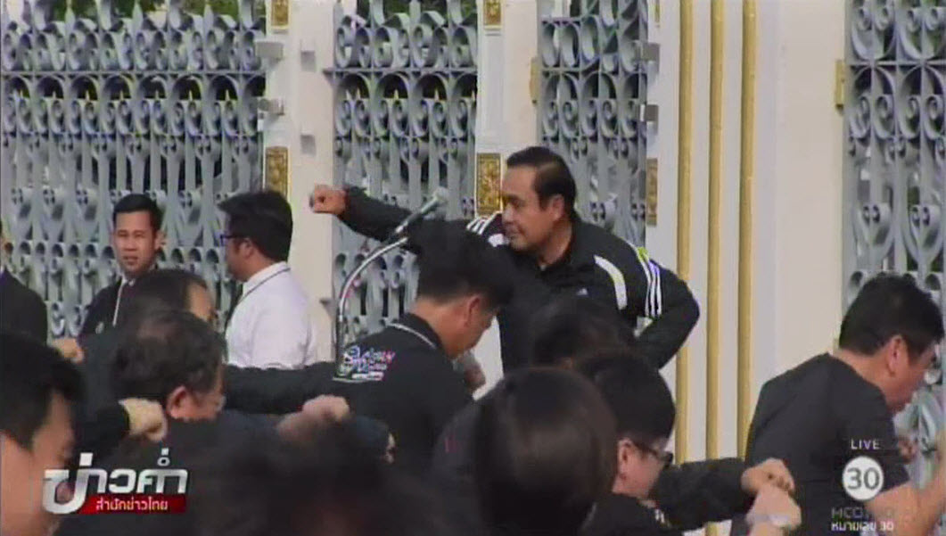 ครั้งนี้นัดแนะ 15.30-16.30 น. จัดเต็ม 1ชั่วโมง แห่งความหฤหรรษ์ ถึงเวลาจริงออกสตร์ทวอร์มเครื่องตั้งแต่บ่าย 15.00 น. ด้วยการเดินรอบทำเนียบฯ เปิดตัวด้วยชุดวอร์มสีดำ พร้อมลูกวอลเล่ย์บอล เรียกพลังก่อนลงสนามจริง ต่อด้วยจานร่อน แถมยังบอกอีกว่า เล่นบ่อยสมัยอยู่กองทัพ จากนั้นเมื่อเข้าสู่ชั่วโมงพลศึกษา นายกฯ สวมบทครูฝึก สั่งโยกซ้าย โยกขวา ตามสไตล์ทหาร มาครบทั้งท่าแทงปลาไหล พุ่งหลัง ก่อนตบด้วยประโยคที่ว่า “…พอก่อนเดี๋ยวผู้นำตายก่อน..” งานนี้รู้เลยว่าฟิตหรือเปล่า!!!