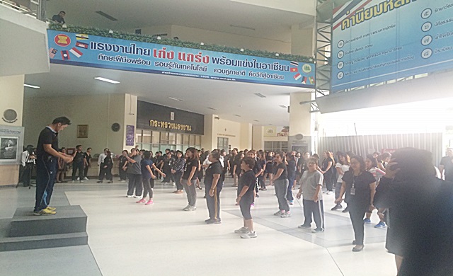 ข้าราชการกระทรวงเเรงงาน พร้อมใจกันสวมเสื้อผ้ากีฬาโทนสีขาวดำเเละออกกำลังกายอย่างพร้อมเพรียง ในท่าทางการวอร์มอัพร่างกาย ซึ่งมีนักพัฒนาการกีฬาจากศูนย์เยาวชนกรุงเทพมหานคร(ไทย-ญี่ปุ่น)นำออกกำลังกาย โดยท่าที่สามารถสร้างเสียงฮือฮาได้มากคือท่าก้มตัวเเตะพื้น เนื่องจากข้าราชการส่วนใหญ่ข้อเข่าไม่ค่อยเเข็งเเรง จึงทำตามได้ยาก.-สำนักข่าวไทย