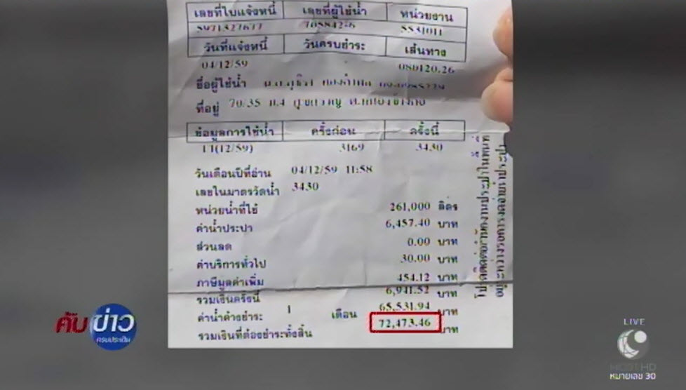 เมื่อวันที่ 20 ธ.ค.59 นางพิมพา พูลชาติ อายุ 50 ปี อยู่บ้านเลขที่ 70/35 หมู่บ้านสุขสราญ หมู่ 4 ตำบลหนองข้างคอก อำเภอเมือง จังหวัดชลบุรี โชว์บิลค่าน้ำของเดือนธันวาคม 2559 ให้ดู บิลใบแรกลงวันที่ 4 ธ.ค. จำนวน 72,473.46 บาท บิลใบที่สอง ลงวันที่ 13 ธ.ค. จำนวน 6,941.52 บาท โดยทั้งสองบิลมีตัวเลขใช้น้ำเท่ากันคือ 261,000 ลิตร