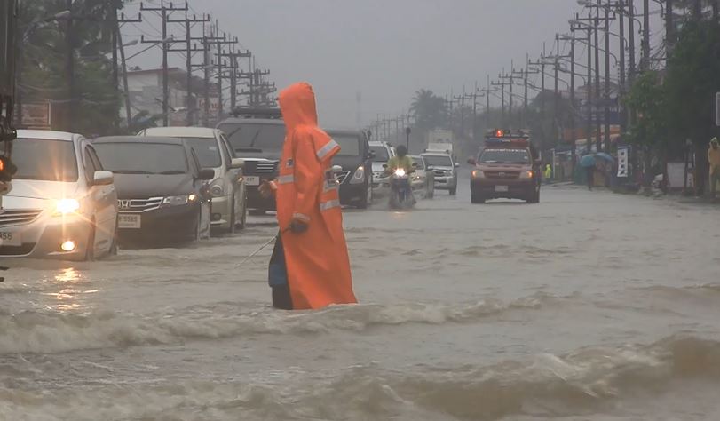 ที่ จ.สงขลา ฝนที่ตกสะสมต่อเนื่องมา 2 วัน โดยเฉพาะในวันนี้(20 ธ.ค.) ซึ่งท้องฟ้ามืดครึ้มและมีฝนตกตลอดทั้งวัน ทำให้เกิดน้ำไหลบ่าเข้าท่วมฉับพลันบนถนนกาญจนวานิช สายหาดใหญ่-สงขลาสายเก่า ในหลายจุด โดยที่หนักสุดอยู่ในพื้นที่บ้านควนหิน หมู่ 3 ต.พะวง อ.เมืองสงขลา ฝั่งขาเข้า อ.หาดใหญ่ น้ำได้ไหลทะลักเข้าท่วมผิวจราจรอย่างหนักเป็นระยะทางเกือบ 1 กิโลเมตร ระดับน้ำสูงประมาณ 50 ซม.และมีแนวโน้มสูงขึ้นอย่างต่อเนื่อง จากปริมาณน้ำที่เพิ่มขึ้นเพราะยังมีฝนตกลงมา ขณะที่เทศบาลตำบลพะวงได้ติดตั้งเครื่องสูบน้ำ เร่งระบายน้ำออกโดยเร็วที่สุด เพื่อป้องกันไม่ให้เข้าท่วมบ้านเรือนชาวบ้าน