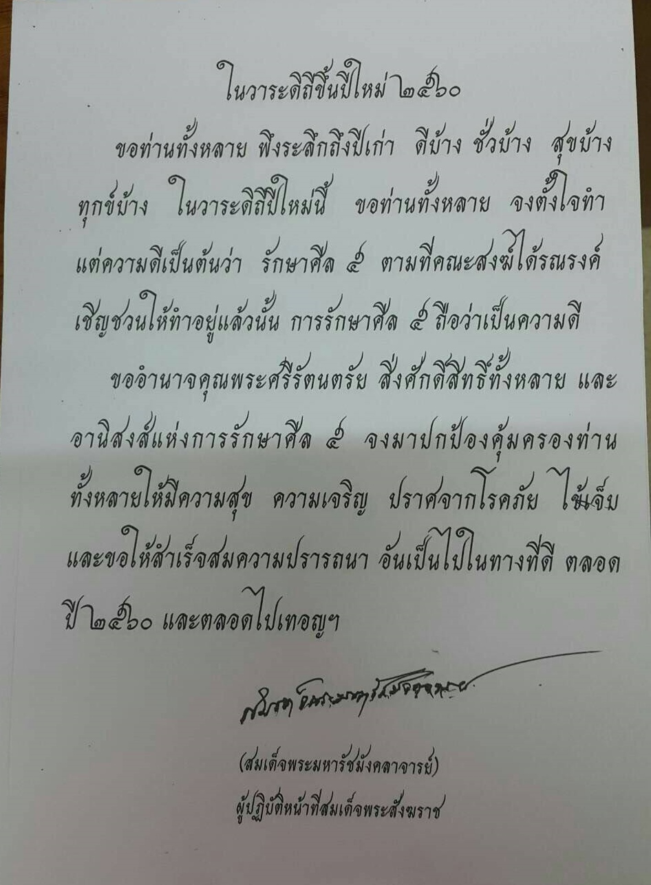 สำนักข่าวไทย 20 ธ.ค. – สมเด็จพระมหารัชมังคลาจารย์ ผู้ปฏิบัติหน้าที่สมเด็จพระสังฆราช อวยพรปีใหม่ 2560ขอให้ตั้งใจทำแต่ความดี รักษาศีล 5