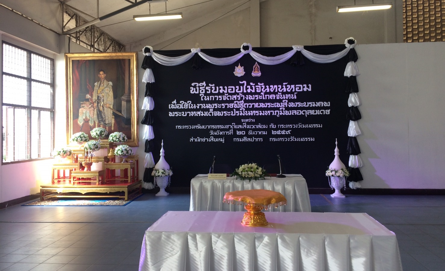 บรรยากาศภายในอาคาร 1 อาคารกลุ่มประณีตศิลป์ สำนักช่างสิบหมู่ ต.ศาลายา จ.นครปฐม ซึ่งจะใช้เป็นพื้นที่สำหรับทำพิธีรับมอบไม้จันทน์หอม จำนวน 1,461 แผ่น จากอุทยานแห่งชาติกุยบุรี สำหรับนำไปจัดสร้างพระโกศจันทน์ เพื่อใช้ในงานพระราชพิธีถวายพระเพลิงพระบรมศพ พระบาทสมเด็จพระปรมินทรมหาภูมิพลอดุลยเดช ขณะนี้ได้จัดเตรียมพื้นที่เรียบร้อยแล้ว พร้อมทั้งจัดแสดงแบบพระโกศจันทน์และหีบพระบรมศพจันทน์ ที่ออกแบบโดยนายสมชาย ศุภลักษณ์อำไพพร นายช่างศิลปกรรมอาวุโส สำนักช่างสิบหมู่ กรมศิลปากร