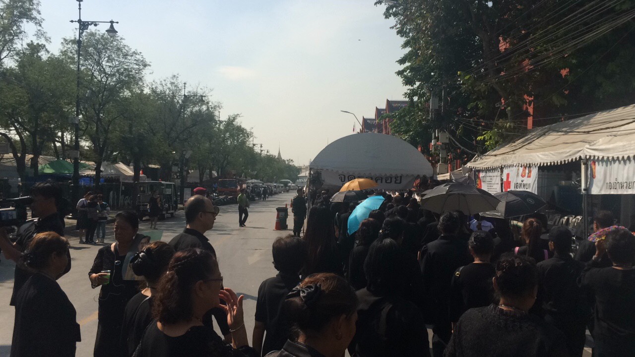 ผู้สื่อข่าว รายงานบรรยากาศที่ท้องสนามหลวง ช่วงเช้าวันนี้(20 ธ.ค.) มีประชาชนจากทั่วทุกสารทิศหลั่งไหลเดินทางมาเข้าคิวรอกราบถวายบังคมพระบรมศพ พระบาทสมเด็จพระปรมินทรมหาภูมิพลอดุลยเดช ณ พระที่นั่งดุสิตมหาปราสาท ในพระบรมหาราชวัง อย่างต่อเนื่อง ท่ามกลางแสงแดดที่ร้อนจัด ซึ่งเจ้าหน้าที่มีบริการแจกร่มให้ประชาชนที่ไม่ได้พกติดตัวมา
