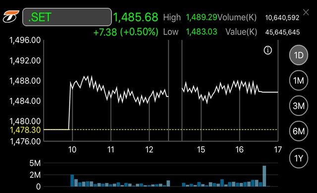 ตลท. 22 พ.ย. – ผู้สื่อข่าวรายงานว่าดัชนีตลาดหลักทรัพย์ปิดการซื้อขายวันนี้ (22 พ.ย.) ที่ระดับ 1,485.68 จุด เพิ่มขึ้น 7.38 จุด หรือร้อยละ 0.50 มูลค่าการซื้อขาย 45,645.65 ล้านบาท โดยดัชนีอยู่ในแดนบวกตลอดทั้งวันรับแรงหนุนจากหุ้นในกลุ่มพลังงานที่ราคาปรับสูงขึ้นตามราคาน้ำมัน โดยดัชนีสูงสุดของวันที่ระดับ 1,489.29 จุด และต่ำสุดของวันที่ระดับ 1,483.03 จุด
