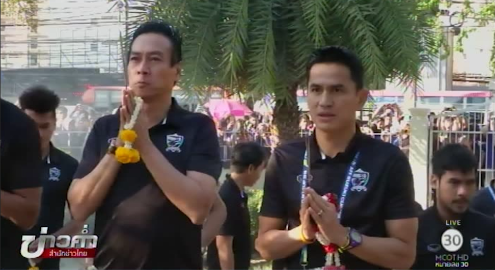 บรรยากาศที่สนามราชมังคลากีฬาสถาน ช่วงบ่ายเวลาประมาณ 16.00 น. นักเตะทีมชาติไทยได้เดินทางมาถึงบริเวณหน้าสนาม นำมาโดย “โค้ชซิโก้” เกียรติศักดิ์ เสนาเมือง หัวหน้าผู้ฝึกสอน และ ธีรศิลป์ แดงดา ศูนย์หน้าตัวเก่ง ที่ยิงไปแล้ว 6 ประตูในรายการนี้ ทั้งหมดร่วมสักการะสิ่งศักดิ์สิทธิ์ ภายในการกีฬาแห่งประเทศไทยโดยมีแฟนบอลจำนวนมากมารอให้กำลังใจและตะโกนสนับสนุน “โค้ชซิโก้” ให้ทำหน้าที่กุนซือต่อไป