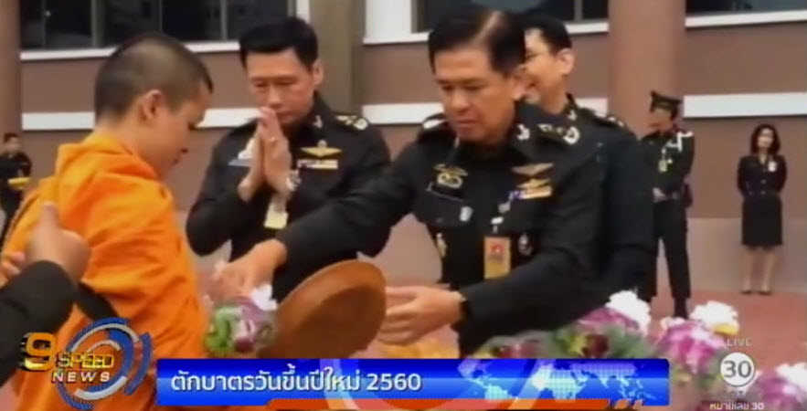 ขณะที่ พล.ต.อ.จักรทิพย์ ชัยจินดา ผู้บัญชาการตำรวจแห่งชาติ นำข้าราชการตำรวจ ทำบุญตักบาตรพระสงฆ์ บริเวณลานด้านหน้าสำนักงานตำรวจแห่งชาติ เพื่อความเป็นสิริมงคลในวันขึ้นปีใหม่ .-สำนักข่าวไทย