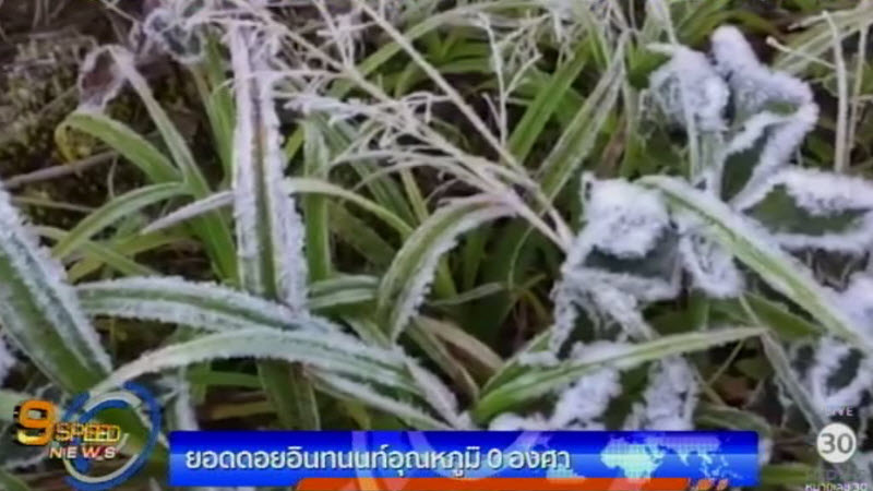 เชียงใหม่ 22 พ.ย. – ดอยอินทนนท์ จ.เชียงใหม่ อุณหภูมิเช้าวันนี้ลดต่ำเหลือ 0 องศาเซลเซียส บริเวณยอดหญ้าบนยอดดอย และบริเวณกิ่วแม่ปาน เกิดน้ำค้างแข็ง (เหมยขาบ) ขาวโพลนเป็นบริเวณกว้าง ติดต่อกันเป็นวันที่ 2 ในฤดูหนาวปีนี้ ส่วนอุณภูมิบนกิ่วแม่ปาน ลดลงเหลือ 2 องศาเซลเซียส ซึ่งเจ้าหน้าที่อุทยานแห่งชาติดอยอินทนนท์ได้บันทึกภาพไว้ ท่ามกลางนักท่องเที่ยวจำนวนมากที่เดินทางขึ้นไปสัมผัสความหนาวเย็น และรอชมเหมยขาบกันเป็นจำนวนมาก. – สำนักข่าวไทย