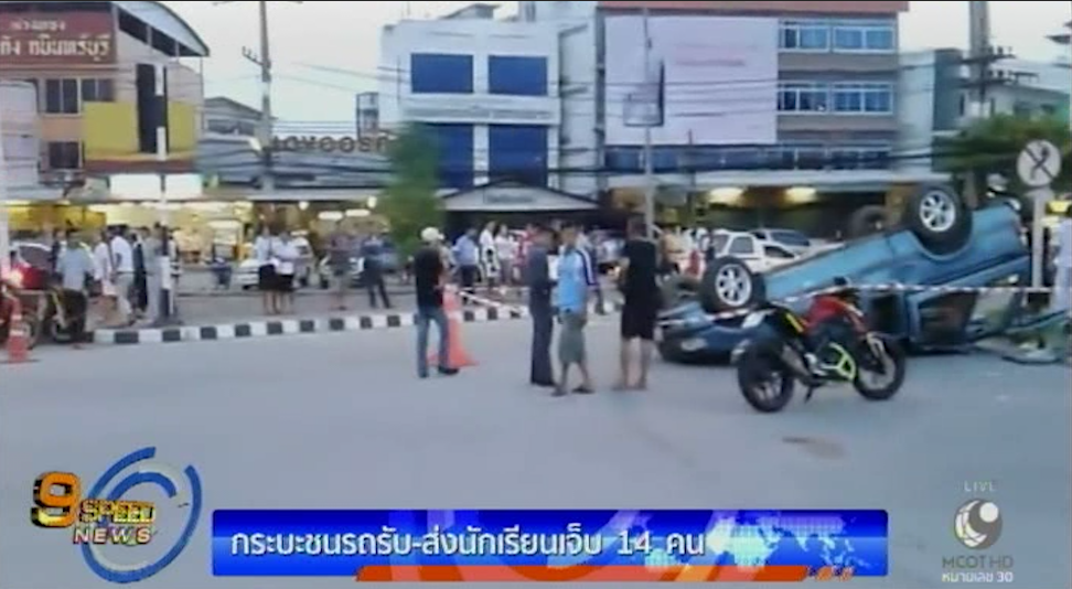 ปราจีนบุรี 21 พ.ย.-กระบะพุ่งชนรถรับ-ส่งนักเรียน บริเวณสี่แยกสามทหาร อ.กบินทร์บุรี จ.ปราจีนบุรี นักเรียนบาดเจ็บ 13 คน คนขับเจ็บ 1 คน
