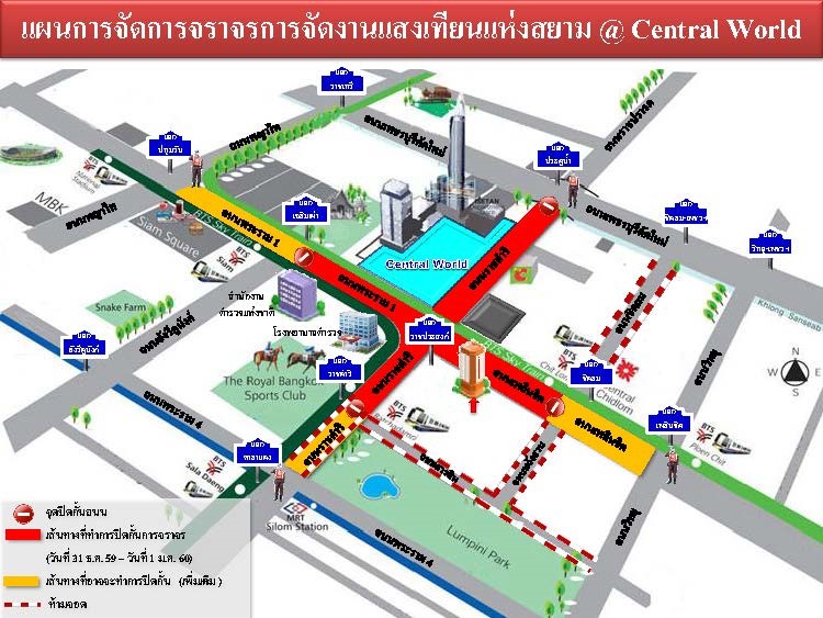 • วันที่ 30 ธ.ค.59 เวลา 18.00 น. ถึง 31 ธ.ค.59 เวลา จนเสร็จสิ้นกิจกรรม ห้ามรถทุกชนิดเดิน จำนวน 2 ช่องทางจราจร ถนนราชดำริด้านซ้ายฝั่งเซ็นทรัลเวิลด์ ตั้งแต่ แยกราชประสงค์ ถึงเชิงสะพานเฉลิมโลก