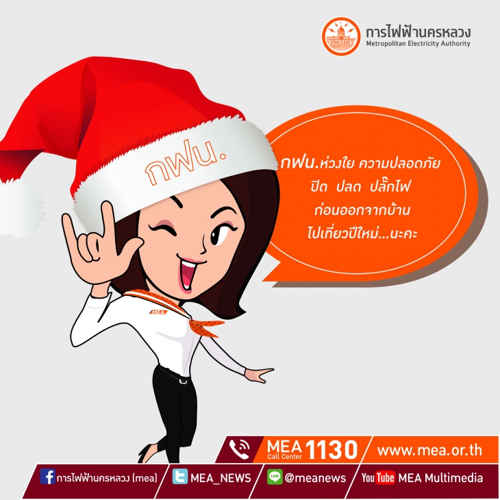การไฟฟ้านครหลวง (กฟน.) ปิดที่ทำการทุกแห่งเนื่องในเทศกาลส่งท้ายปีเก่า ต้อนรับปีใหม่ 2560 ระหว่างวันที่ 31 ธันวาคม 2559 – 3 มกราคม 2560 โดยในช่วงปิดที่ทำการดังกล่าว กฟน.ยังคงให้บริการแก้ไฟฟ้าขัดข้อง และศูนย์บริการข้อมูลผู้ใช้ไฟฟ้า MEA Call Center โทร.1130 เปิดให้บริการทุกวันตลอด 24 ชั่วโมง